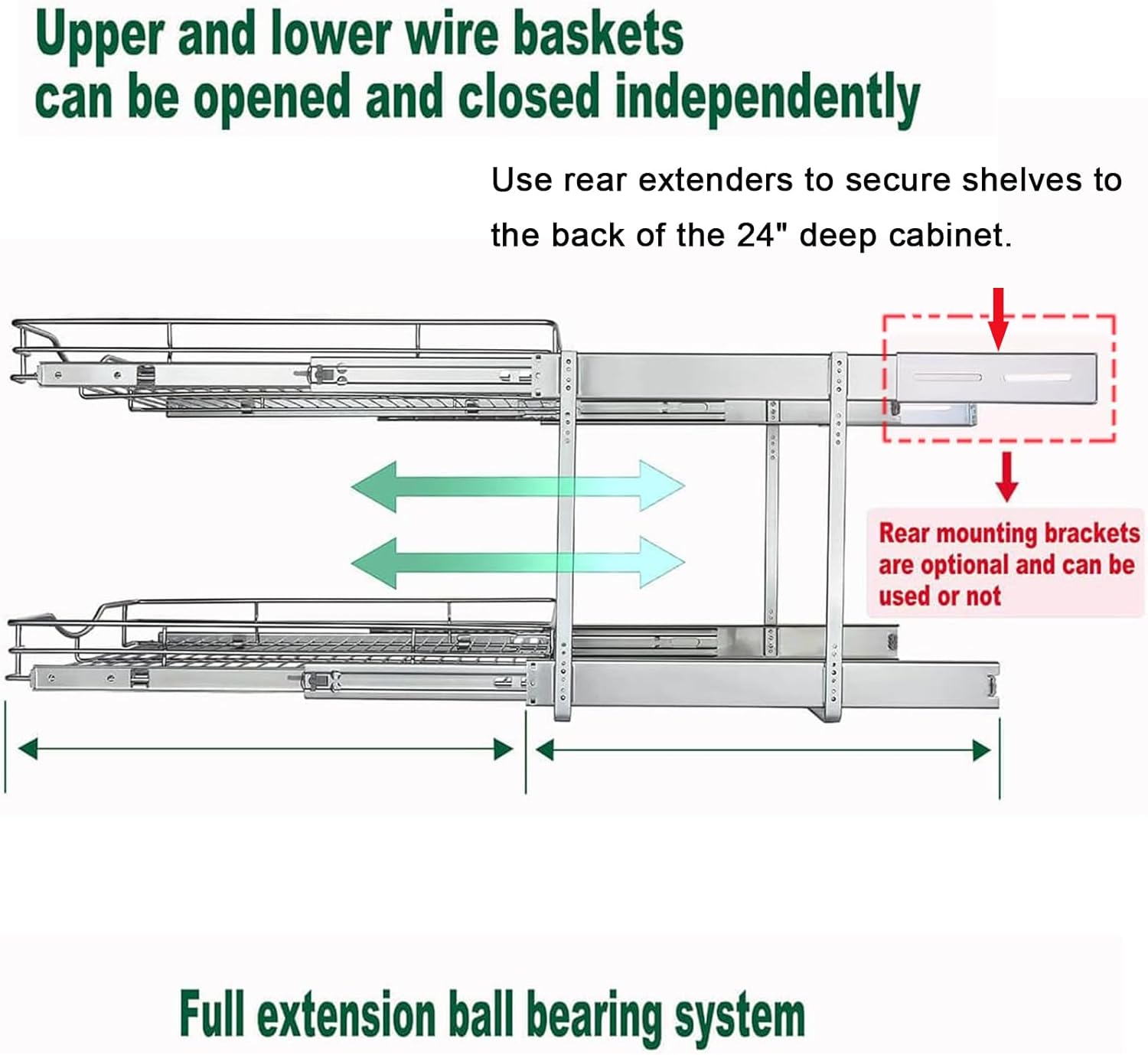 - ※ Unique Design: unlike other pull out cabinet organizer, DINDON 2 tier cabinet pull out shelves is double sliding, this cabinet organizer upward hook connecttion wire basket design make it easy assemble and more durable, full extension ball-bearing 3 section slide out slides let you easy access all the items.