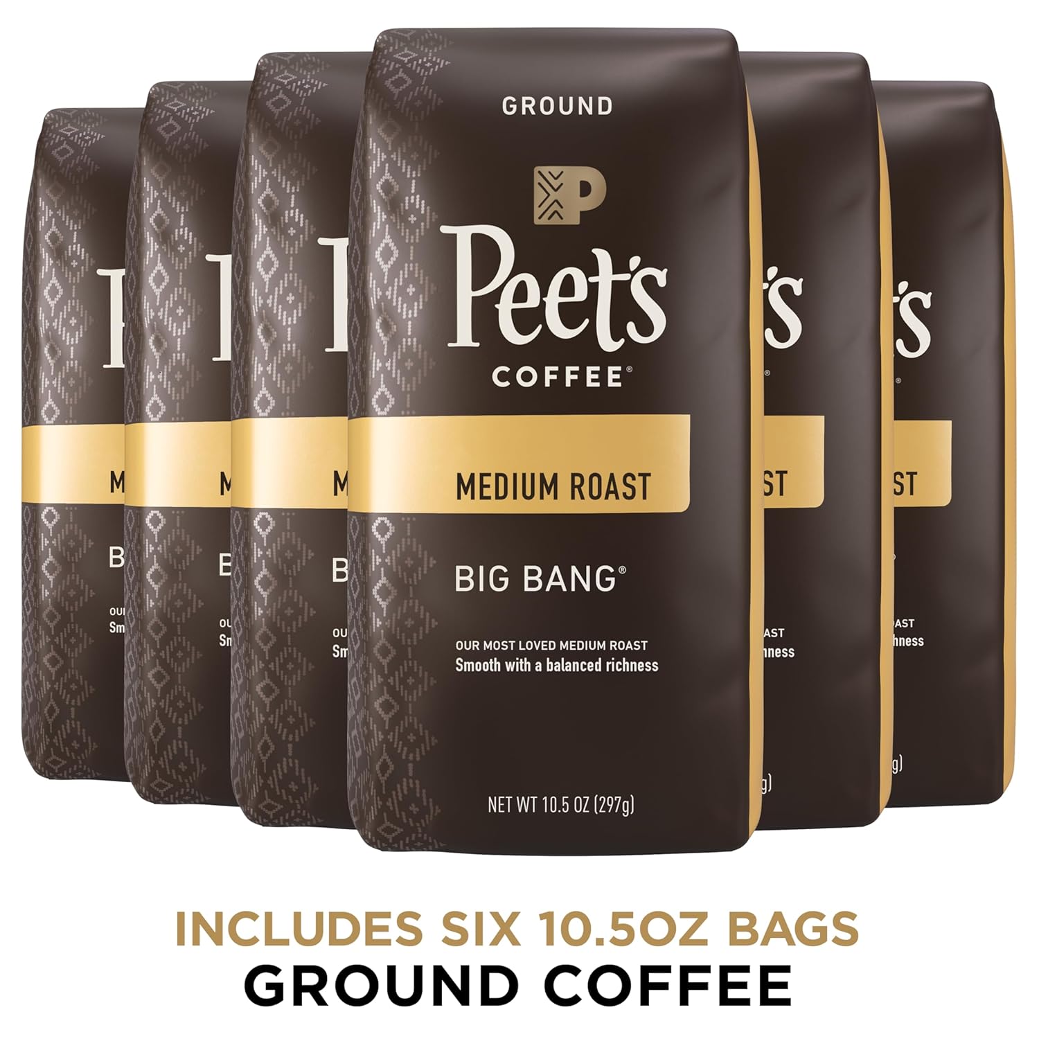 - Contains six (6) 10.5 Ounce Bags of Peet's Big Bang Ground 100% Arabica Coffee