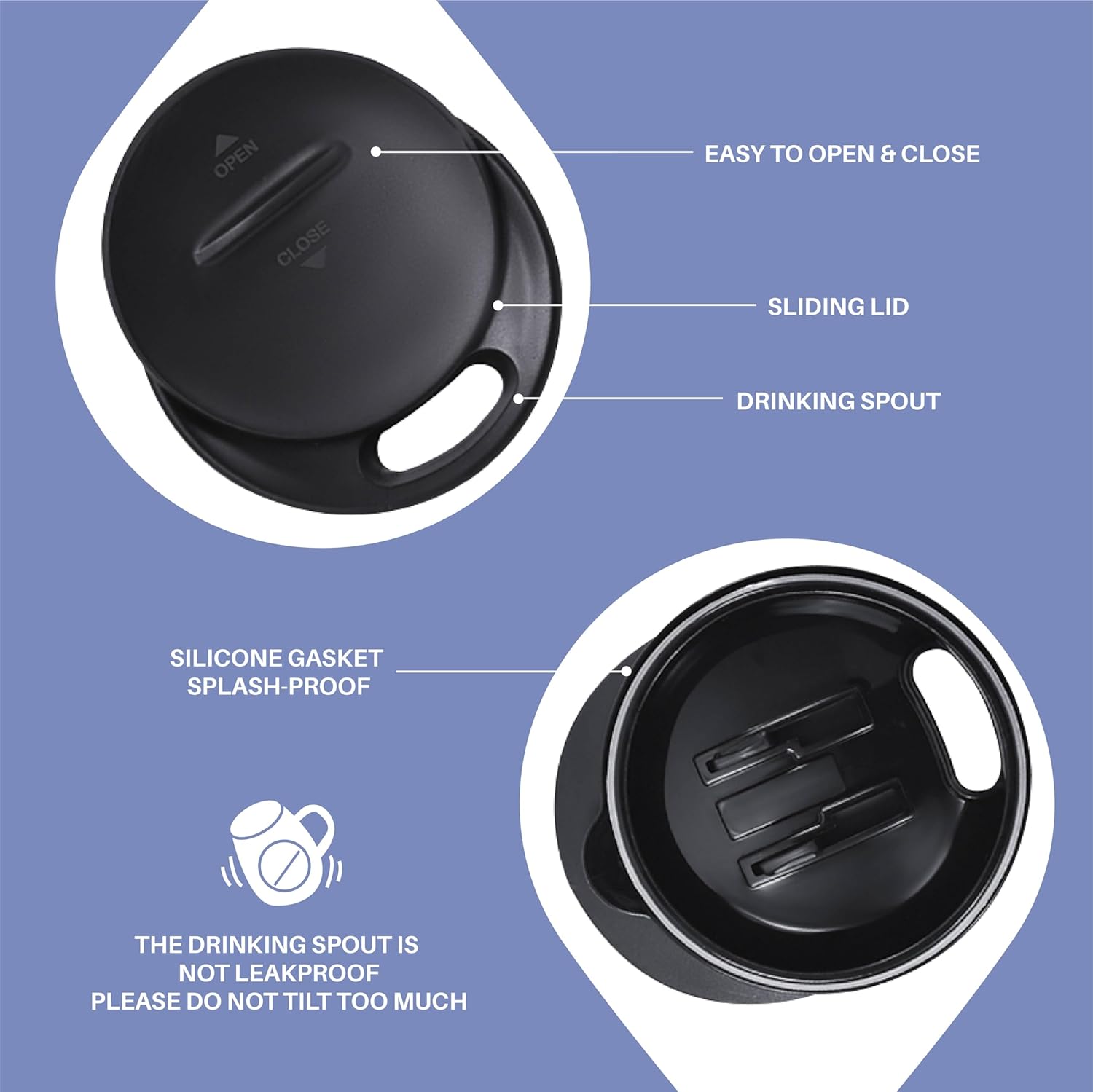 - 【PRESS-IN LID】- Silica gasket seals to achieve maximum spillproof capability. Drinking hole on the top, with a splash-proof sliding cover. Please note it is to keep drinks contained and prevent heat/cold from escaping. It is not leakproof.