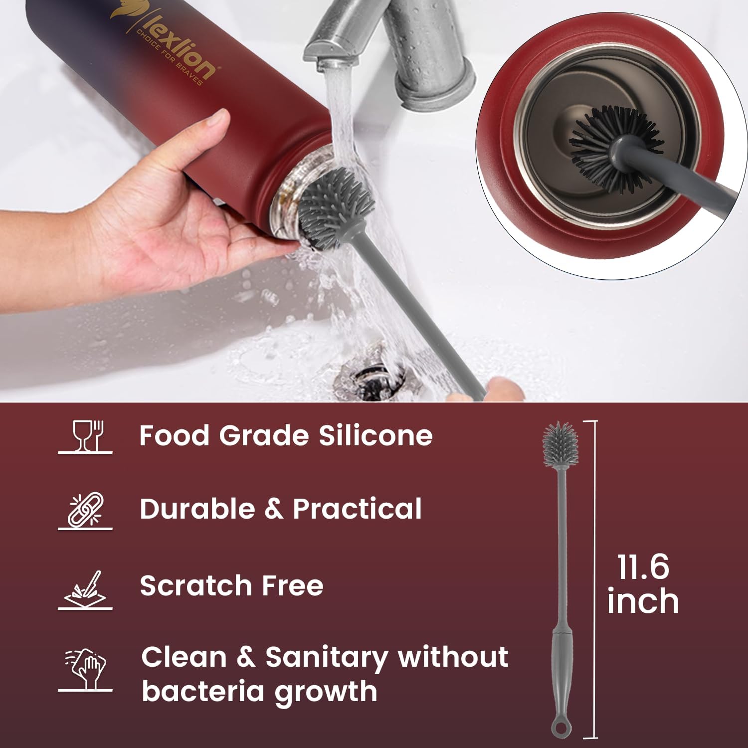 - ✅ SILICON CLEANER BRUSH - Our silicone bottle cleaner brush repels unpleasant odors, and stains, - unlike sponge and nylon brushes - preventing nasty stain build-up so more healthier for your family. It cleans all nooks, and crannies and reaches all the areas of your insulated water bottle 32 oz, and tea/fruit infusers. You will no longer worry about the smelly sponge bristles. The bristles of the thermos water bottle 32 oz brush always keep their shape and it is scratch-free.