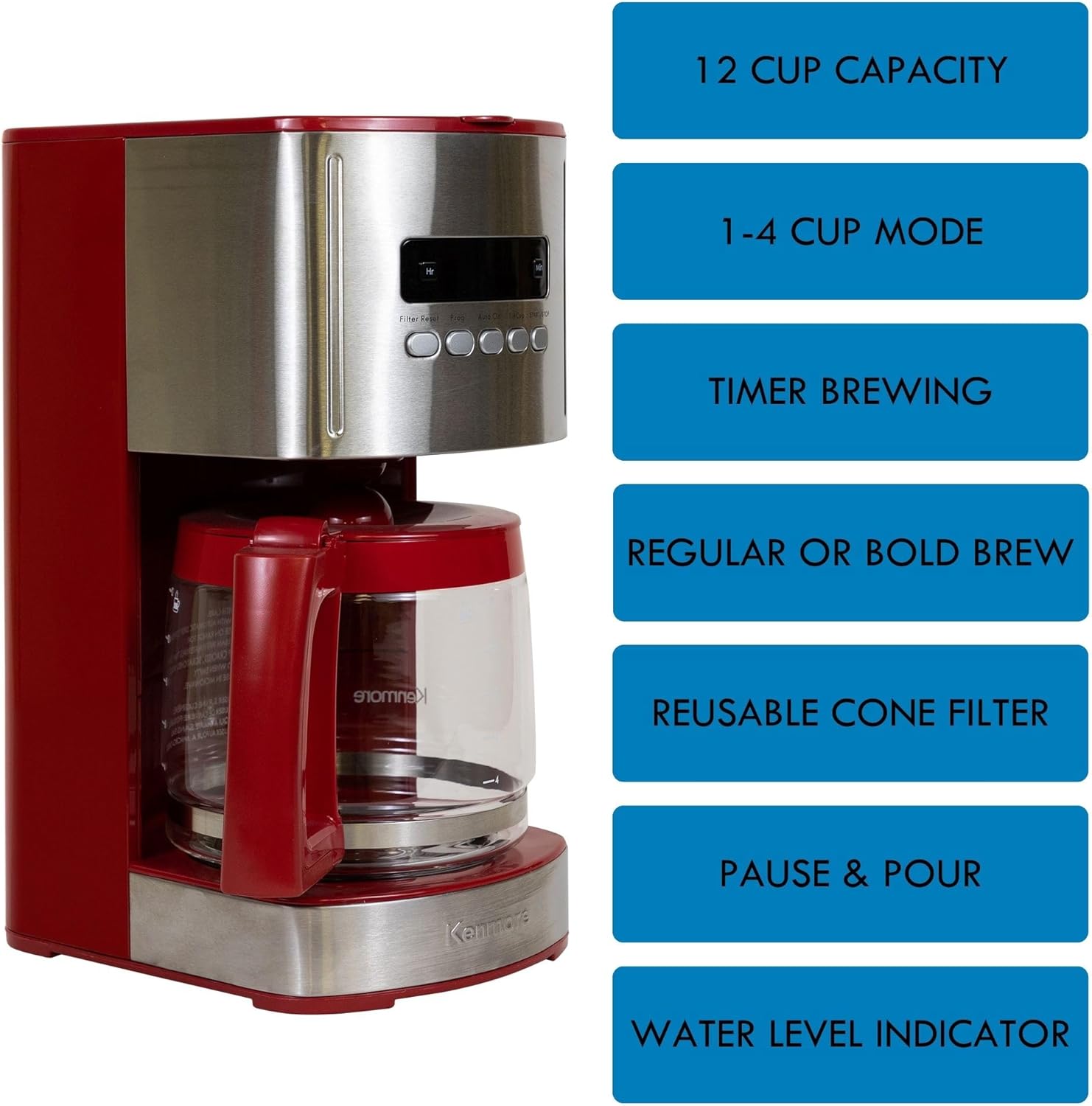 Kenmore Drip Coffee Maker - 12 Cup Programmable Cafe Machine With Glass Pot, Regular & Bold Brew, Auto Shut Off Large Water Reservoir, Reusable Filter, Kitchen Appliances For Cafeteria Barista, Red