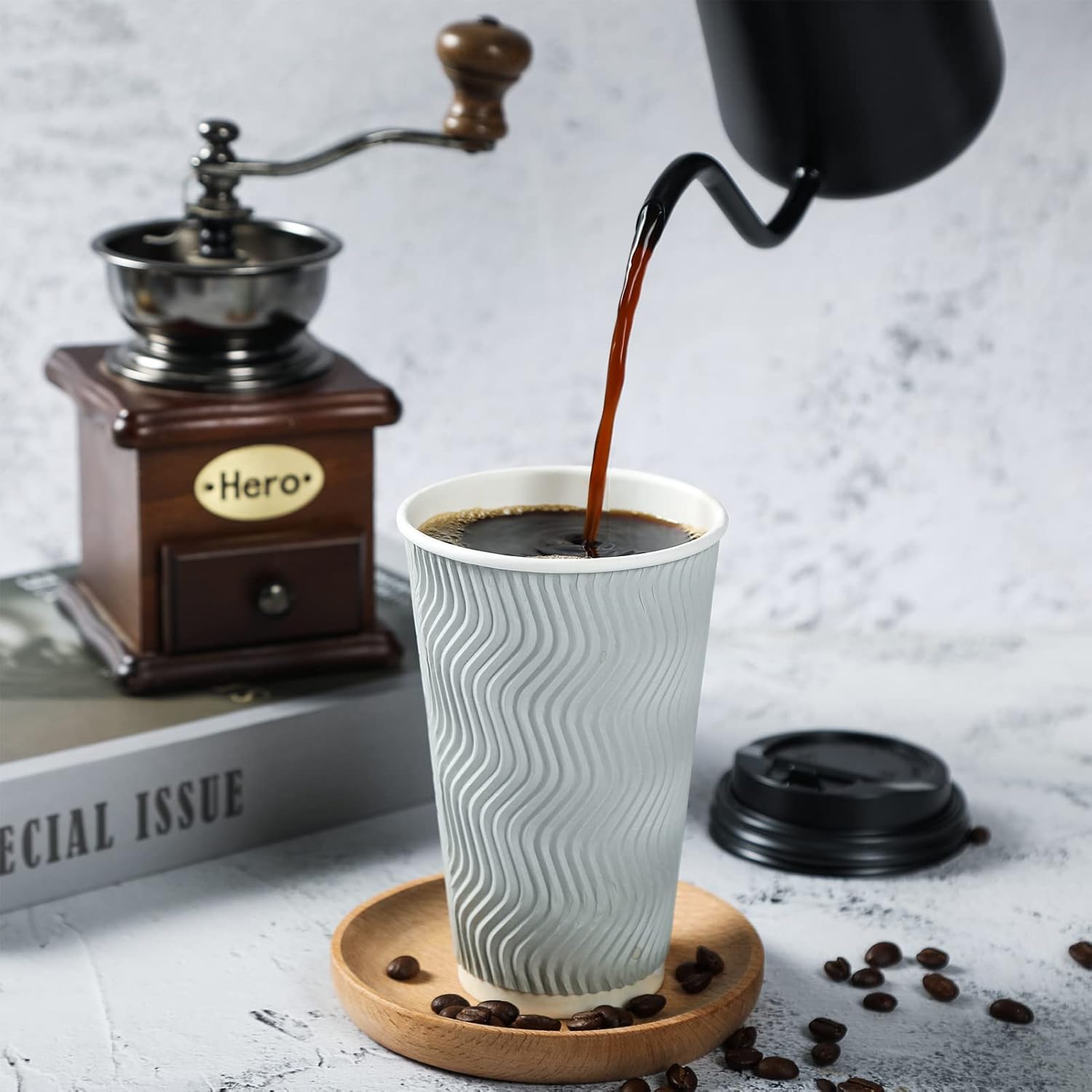 - Materials: Each disposable paper coffee cup 16 oz is made of high thickened paper. Silver grey kraft paper of outer layer is pressed out in smooth ripple patterns for non slip grip and comfortable touch. Elegance and quality coexist for one cup