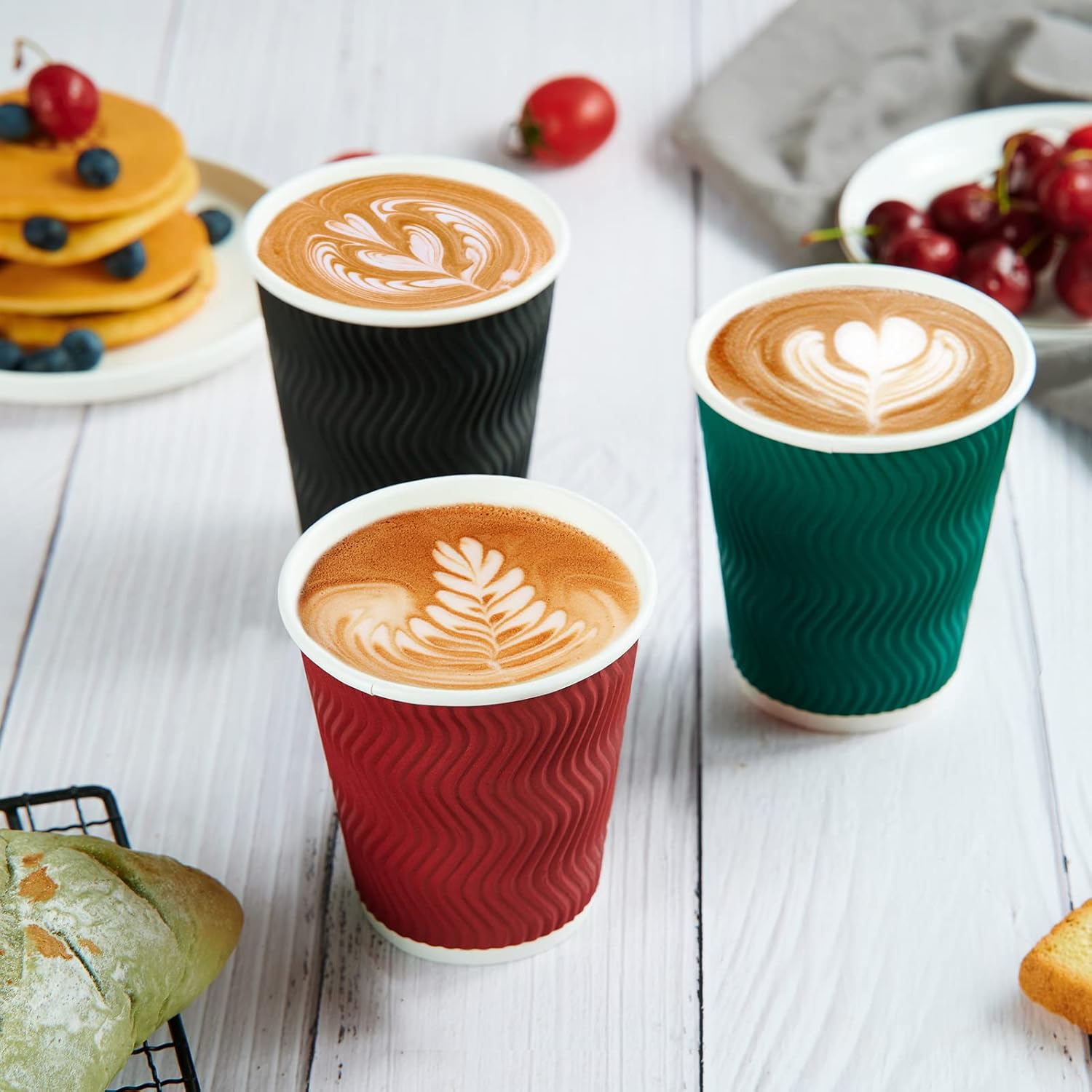 - Package: 120 pack insulated paper coffee cups with 3 colors (red, black, green) is a great deal. Classic and elegant design make these hot coffee cups versatile, perfect for daily or office use, as well as for business use in cafe shops or restaurants