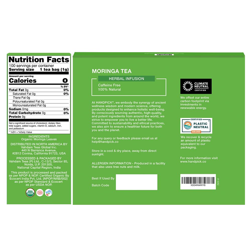 HANDPICK, Organic Moringa Tea Bags (100 Count), Pure Moringa Leaves | Authentic Indian Origin | Caffeine Free, Non GMO | Earthy, Light & Refreshing | Round Eco-conscious Teabags