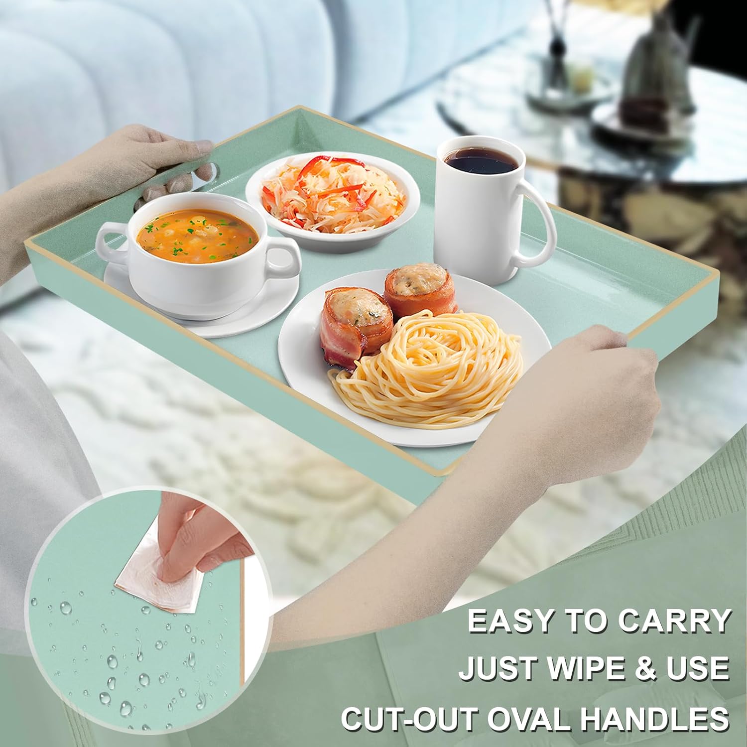 - EASY TO CLEANING: Coffee table tray featuring a classic rectangle design with a mint green glossy finish and golden top edging, brings a elegance and adds a beautiful touch. Modern mint green serving tray has a smooth surface that is waterproof and easy to clean, just use a damp cloth to clean.