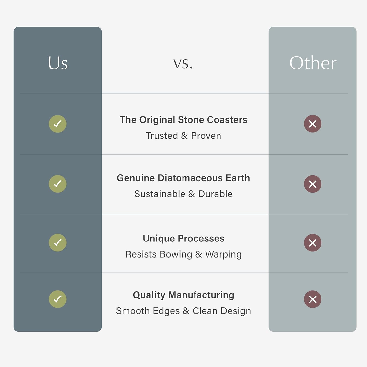 - STONE DECOR: Combining style and utility, our absorbent stone coasters are the perfect complement to your home decor, kitchen, bar, or bathroom, providing unparalleled protection for your counter or table. These water absorbing coasters for drinks make stunning coffee bar accessories or elegant coffee table decor for any space.
