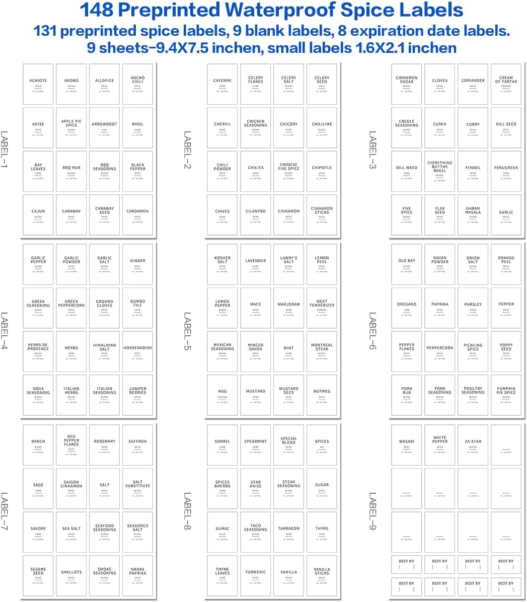 - 【MINIMALIST-WATERPROOF SPICE LABELS】Our square bamboo lid spice jars labels include 131 preprinted spice labels, 9 blank labels, 8 expiration date labels. These spice stickers are high contrast for easy reading. Vinyl labels are preprinted on water resistant white matte backing that won't peel off or tear, can be removed and replaced. Perfect fit 5oz spice organizer jars.