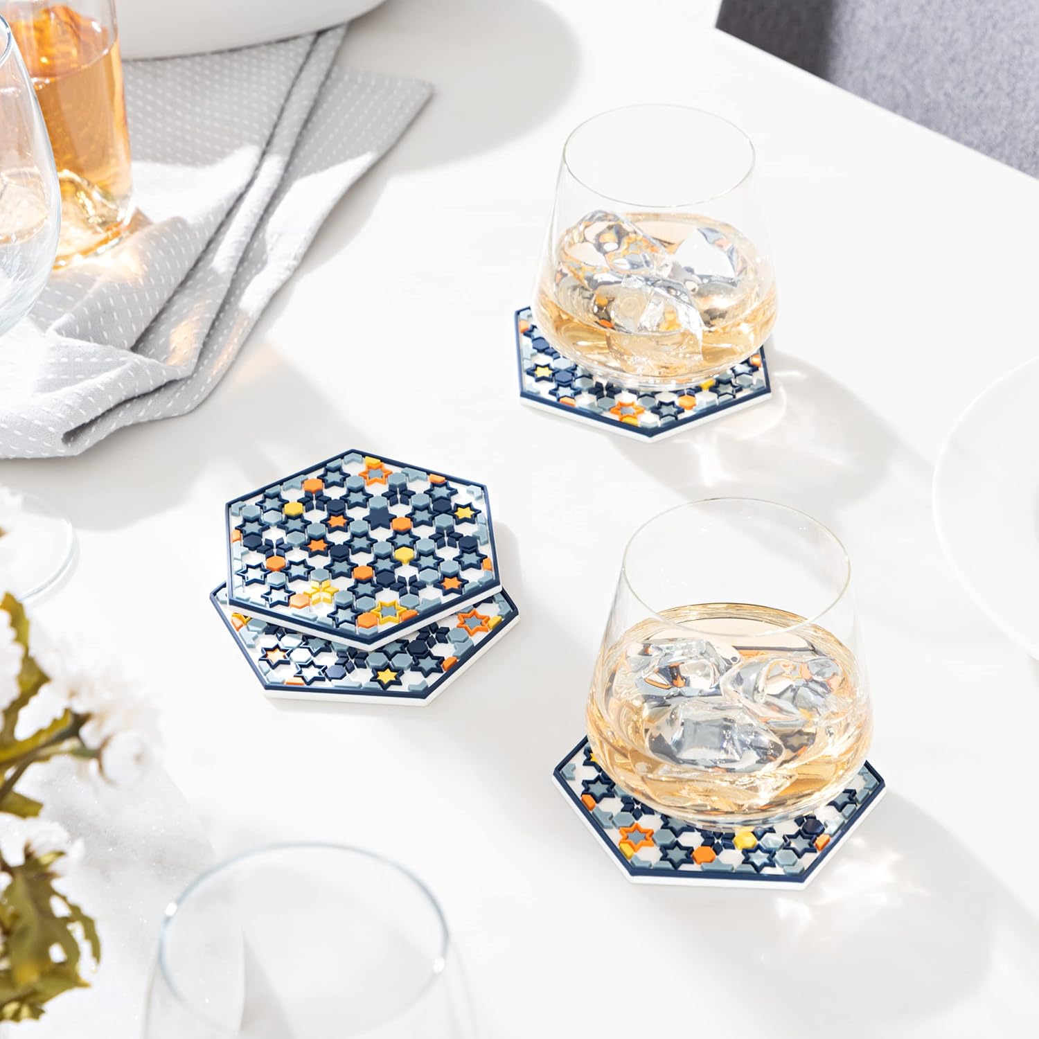 - COLORFUL DESIGNS THAT YOU WON'T SEE SIMILAR ANYWHERE Our designs are based on 3D geometric patterns from ancient history, we applied the designs on 3D colorful coasters that will add a nice touch to your home collection