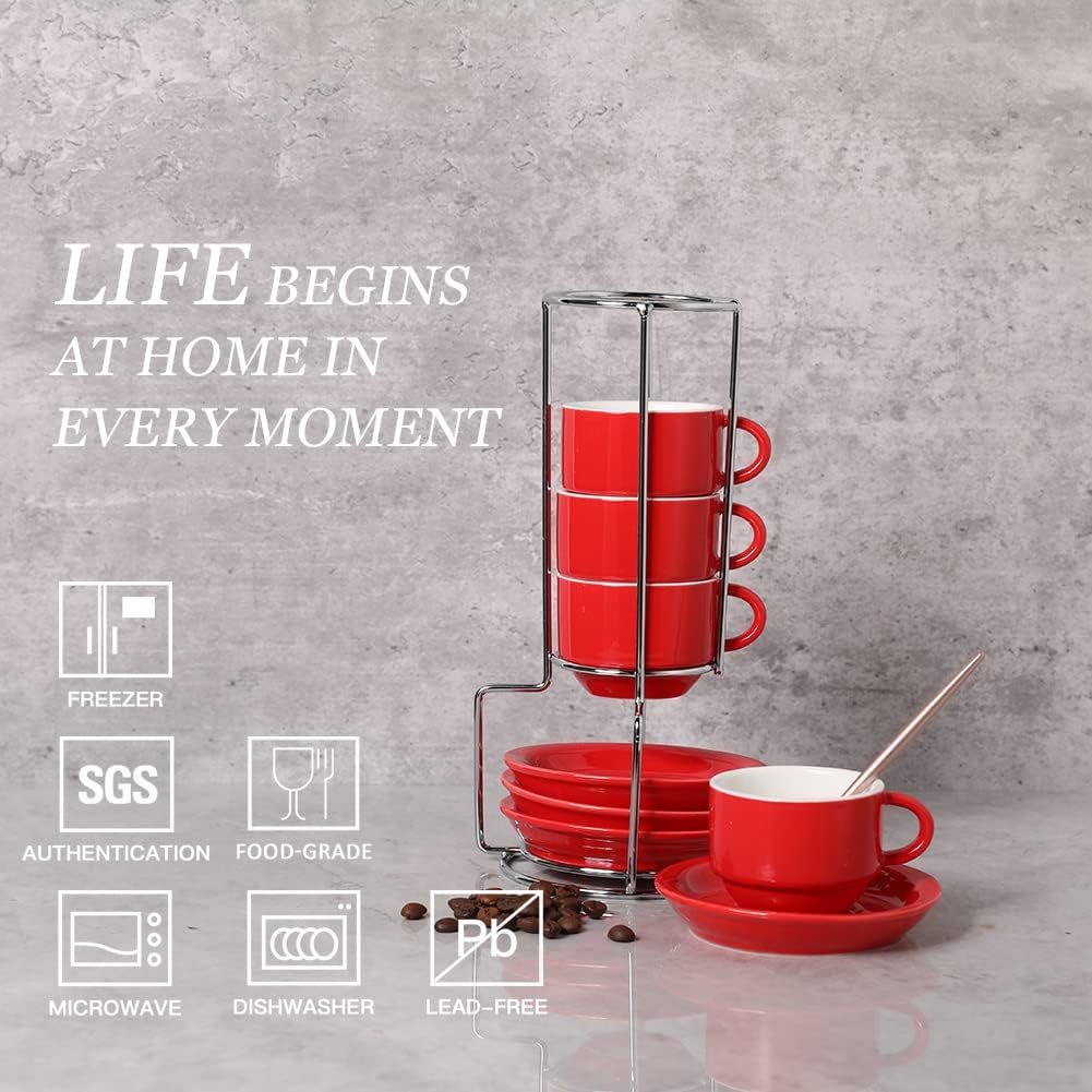 Sweejar Porcelain Espresso Cups with Saucers, 2.5 Ounce Stackable Cappuccino Cups with Metal Stand for Coffee Drinks, Latte, Tea - Set of 4 (Red)