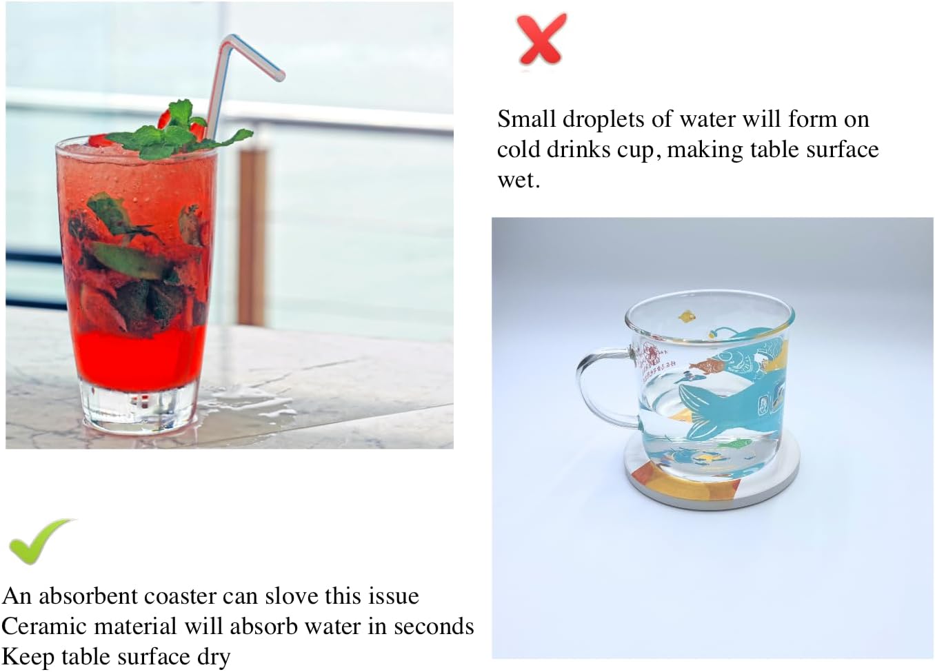 - [Absorbent] Ceramic coasters are made from ceramic material with strong absorption, it absorbs water stains in seconds to keep tabletop surface dry