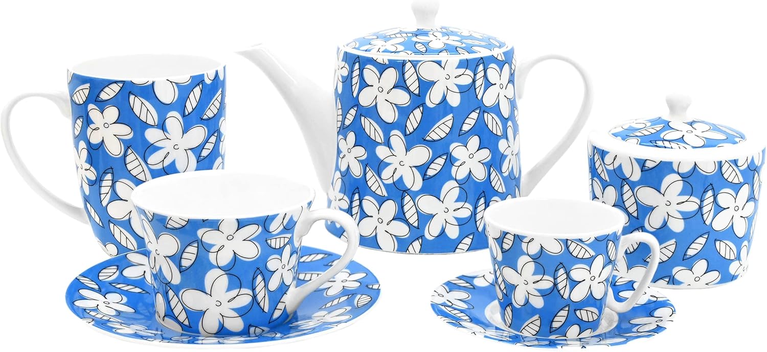 Romero Britto Bone China Coffee & Tea Pot, 28.7 oz, Blue Flowers, Floral Artwork Design