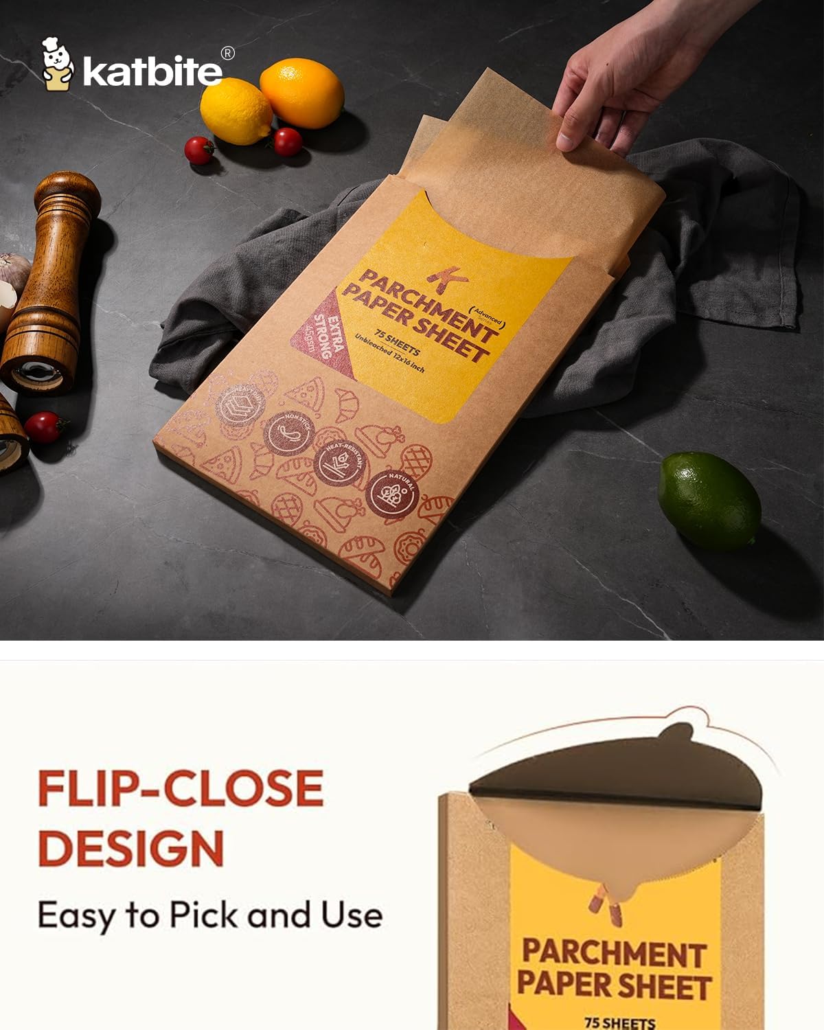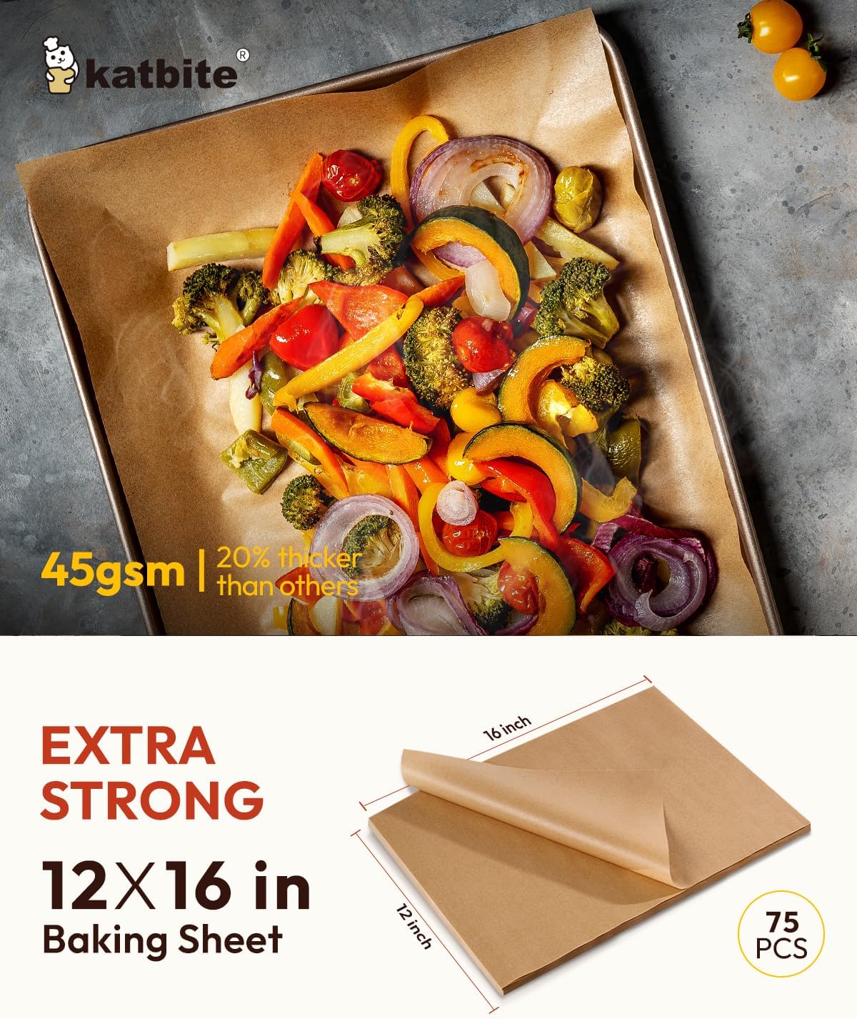 Katbite 75Pcs Unbleached Parchment Paper Sheets 12x16IN, Pre-Cut Heavy Duty Parchment Baking Paper, Non-Stick Half Sheet Brown Baking Parchment Paper for Air Fryer, Baking Cookie [Advanced Series]
