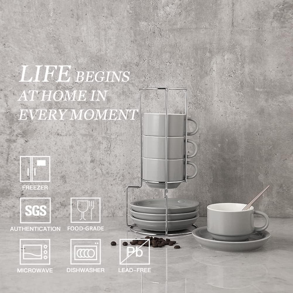 Sweejar Porcelain Espresso Cups with Saucers, 4 Ounce Stackable Cappuccino Cups with Metal Stand for Coffee Drinks, Latte, Tea - Set of 4 (Gray)