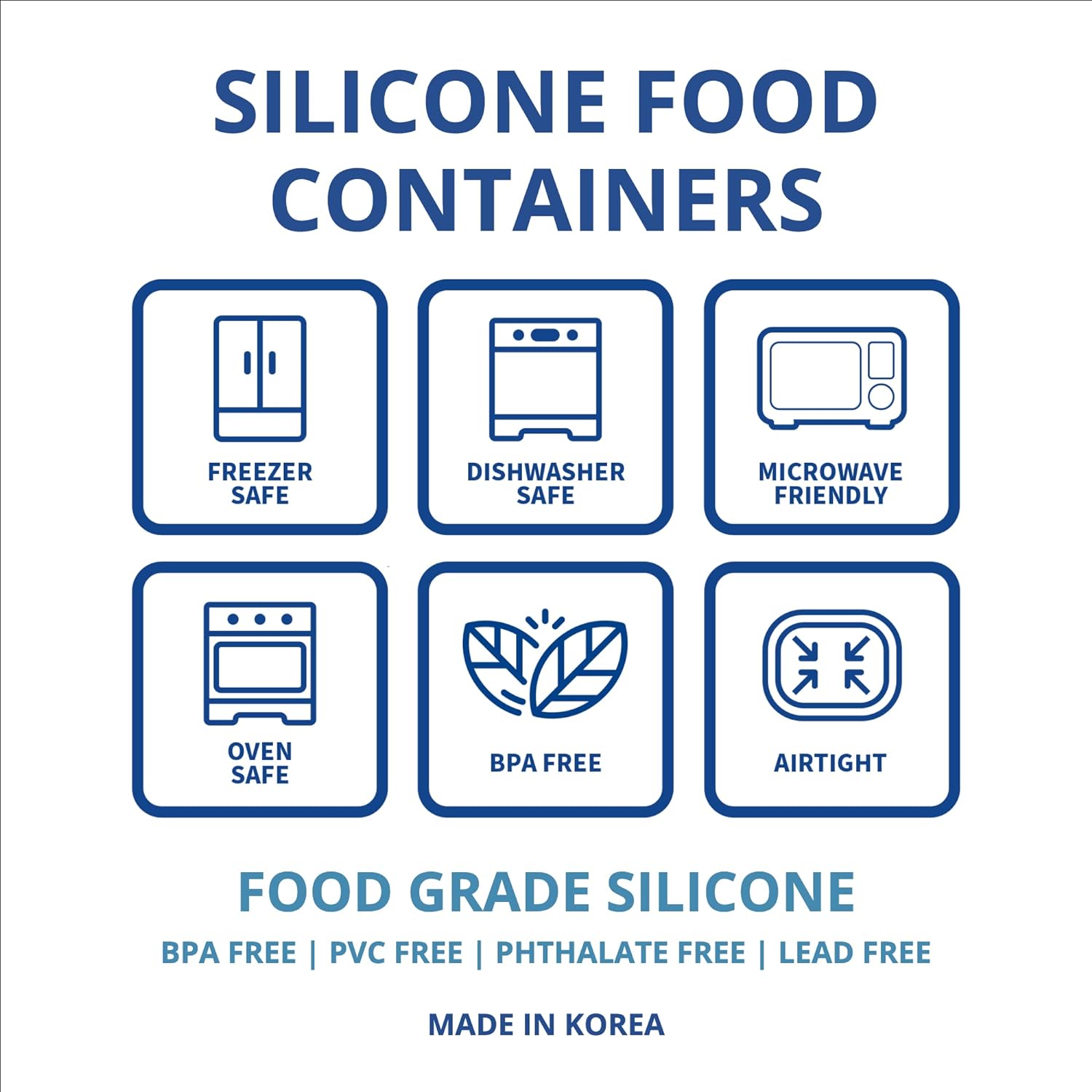 - Food Grade Silicone - For ease of use and mind, our silicone containers for food storage are made in South Korea using premium food-grade silicone that is free of BPA, PVC, Latex and Phthalates.