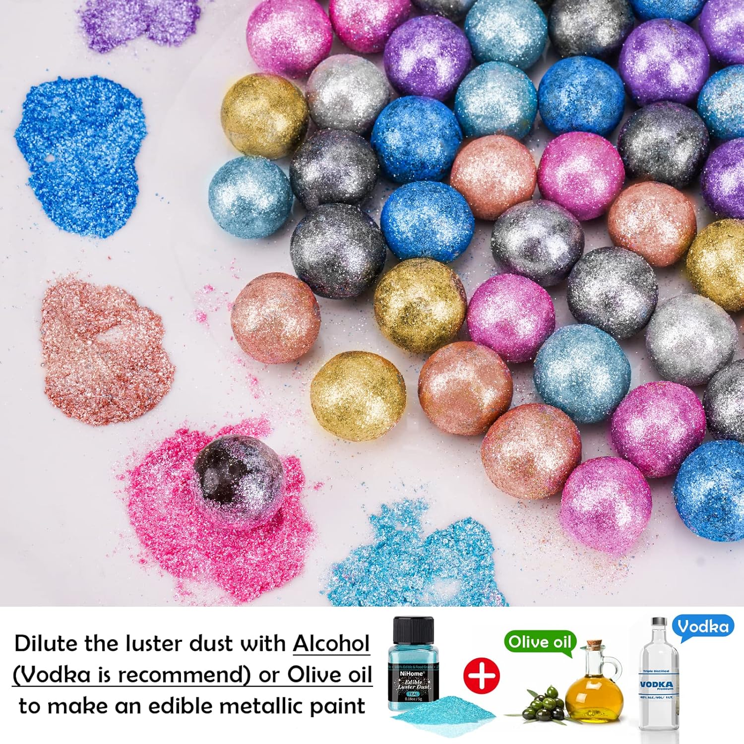 - ✔️【Edible Luster Dust】KOSHER, HALAL, HACCP and Vegan Certified. 100% edible food-grade glitter powder in 0.18 oz/5 g size to meet your needs in breweries, distilleries, restaurants and food service industry. This vibrant, edible luster dust glitter can elevate cakes, cupcakes, cookies, wine, cocktails, champagne, and other baked goods by giving them a stunning glimmer. It is the perfect complement to cocktail drinks, adding unlimited sparkle, glitz and fun to your drink and evening out!