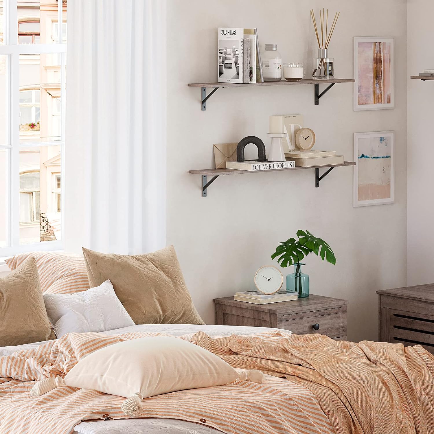 DINZI LVJ Wall Shelves, 23.6 x 7.9 x 6.1 Inch Floating Shelves for Wall, Set of 2, Easy-to-Install Wall Storage Ledges with Sturdy Metal Brackets for Living Room, Bathroom, Kitchen, Greige