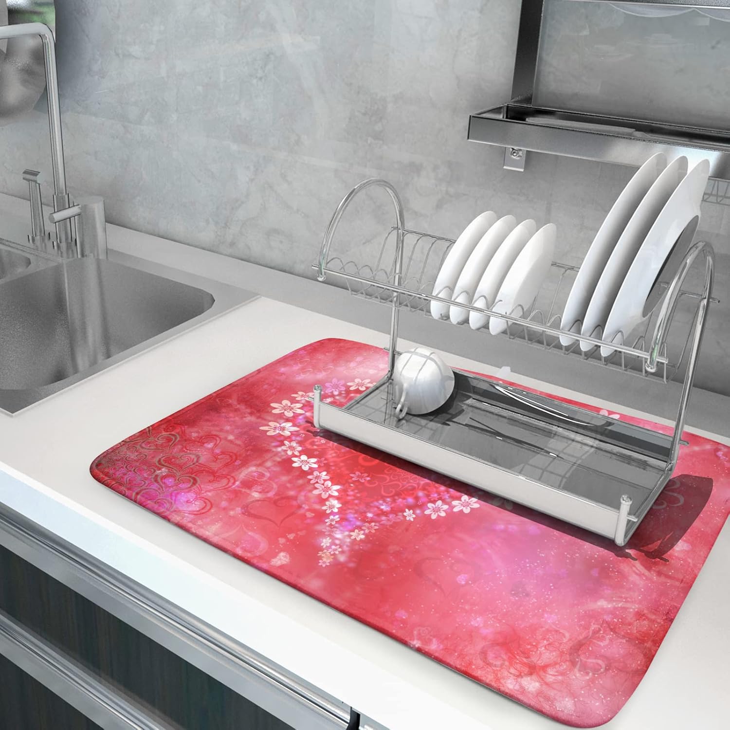 - 2【Widely Used】: The valentines day drying mat for kitchen counter, coffee bar, dish drain rack, great for air drying dishes, glasses, silverware, pots, pans, fruits and vegetables. It's fade resistant and never stain your kitchen counter topand keep your counter dry.