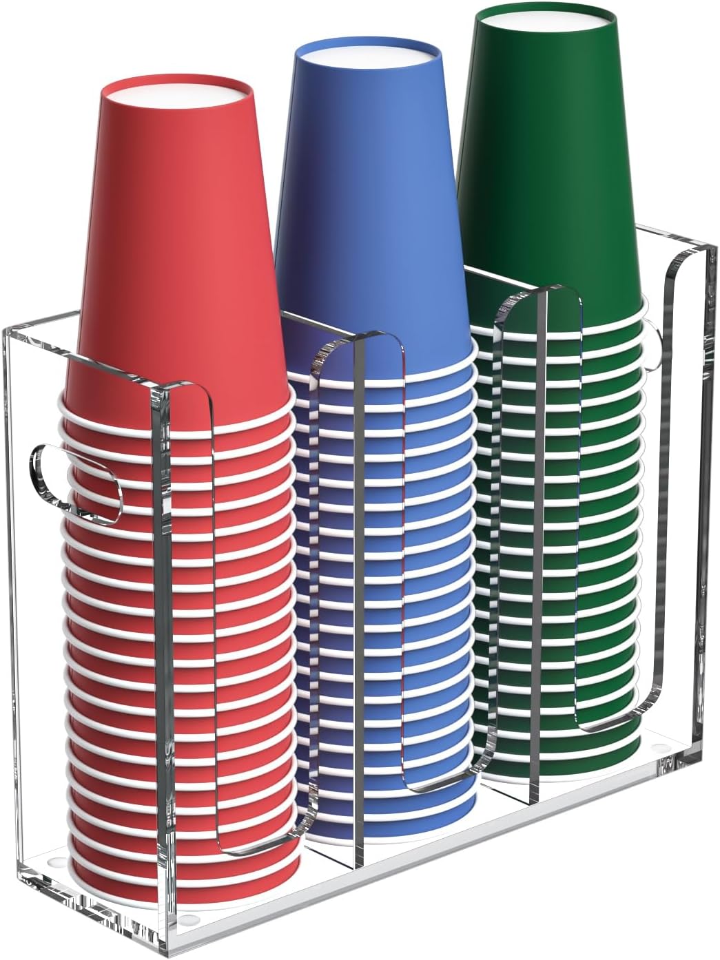 - Material - made of 4mm thickness acrylic, the disposable cup organizer is an ideal container to make your home kitchen bathroom or break room office coffee station area less cluttered, it keeps plastic or paper coffee cups or tops organized. No more cups and lids floating around when wind picks up.
