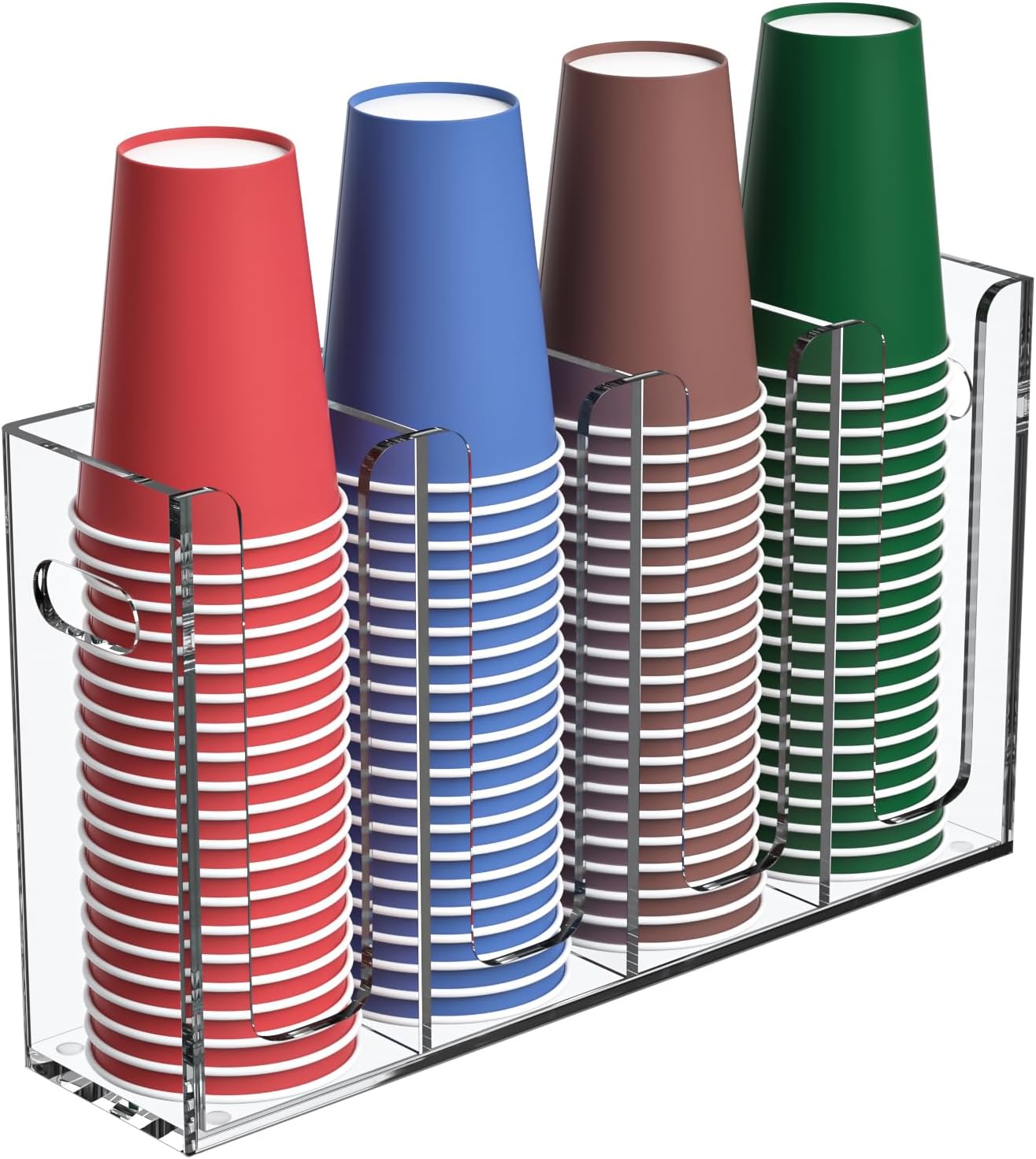 - Coffee Cup Dispenser - holds 3.54'' dia 10 oz, 12 oz, 16 oz disposable paper/plastic cups, acrylic coffee cup dispenser organizes stacked paper coffee cups and lids. No sharp curves, rounded edges on all sides, never worry about getting your fingers nicked.