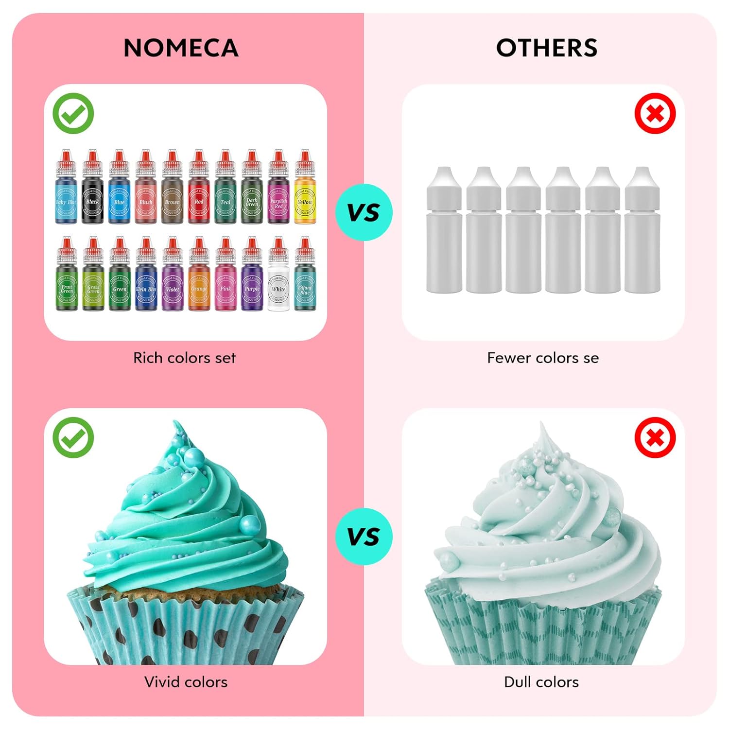 - Full of Variety Oil Based Food Coloring Set - Our set has everything from common colors to unique colors.20 food coloring set includes RED,PINK,BLUSH,PURPLISH RED,BLUE,TEAL,TIFFANY BLUE,KLEIN BLUE,BABY BLUE, GREEN,GRASS GREEN,FRUIT GREEN,DARK GREEN,ORANGE, YELLOW, VIOLET, PURPLE,BLACK,WHITE,BROWN