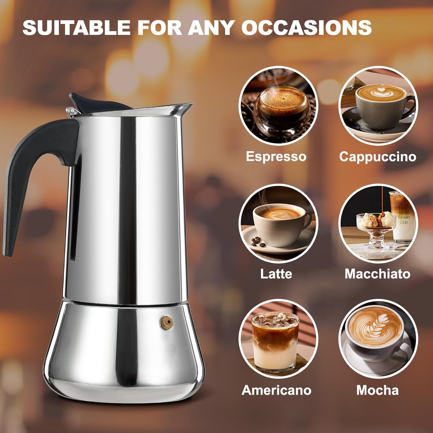 - Compatible with All Stovetops: This stovetop espresso maker is suitable for any stove, such as gas, induction stove, ceramic stove, electric stove, alcohol stove and propane camping stove. You don't need to go out, you can easily make your favorite lattes, mochas, smoothies, macchiatos and cappuccinos.We use high quality ingredients to make the extraction, making the coffee more flavorful and bringing you high quality coffee enjoyment