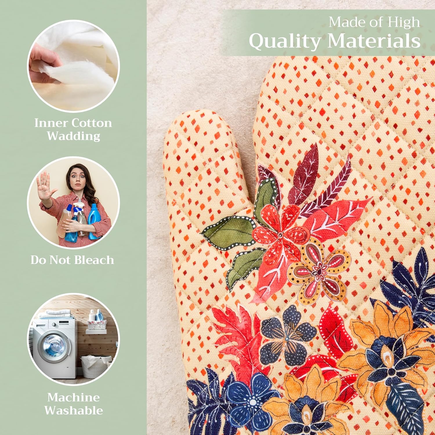 - 100% Quilted cotton: Crafted from thick, durable quilted cotton, this heat resistant oven mitt provides a soft feel, safe handling, and lasting performance. A must-have kitchen accessory for everyday cooking, roasting, or baking tasks