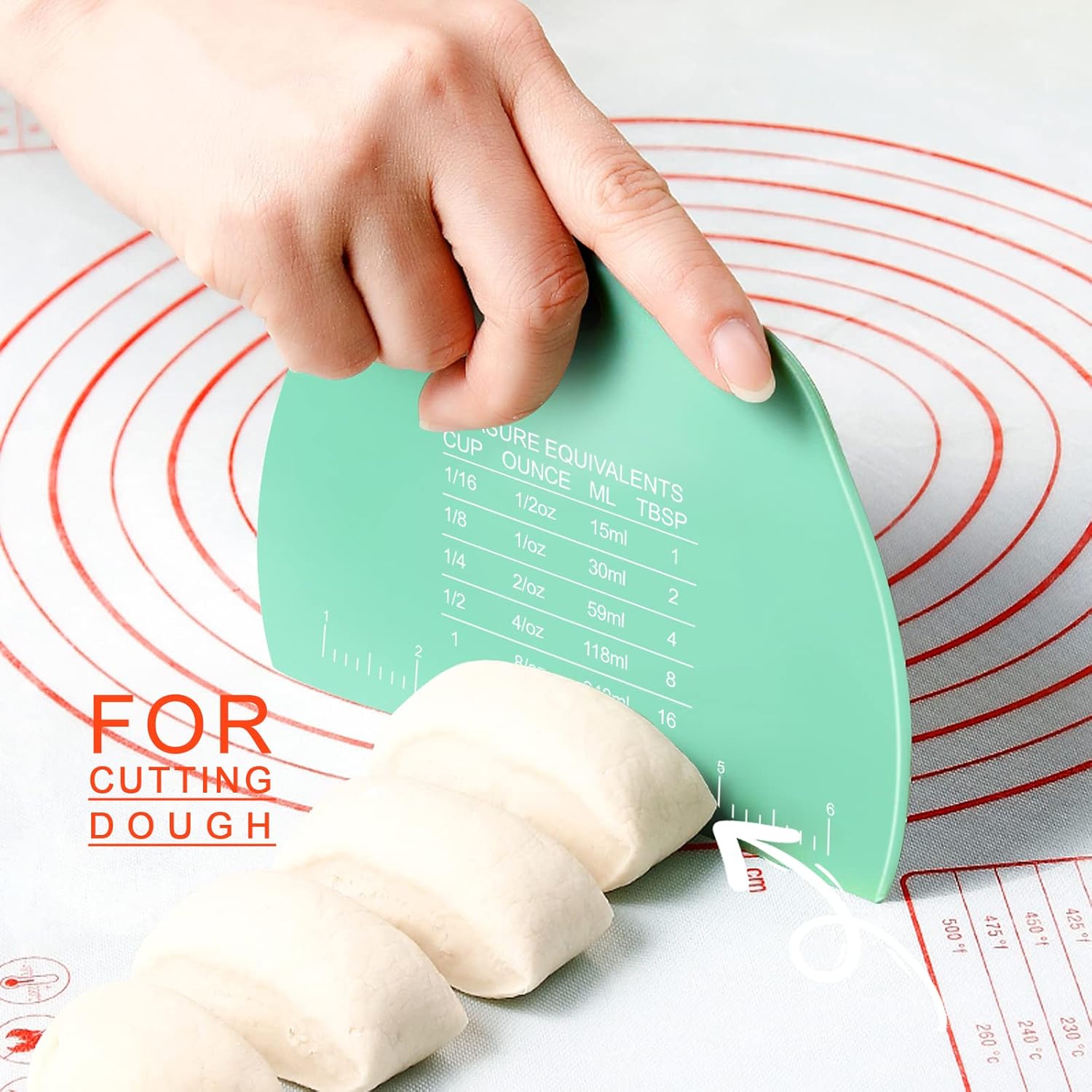 - Dough Scrapers with Baking Measurement Scale: One side dough scraper marked inch scale and measure equivalents, the other centimeter scale. These on dough scrapers help make equal portions and interconversion of ounces, cups, ml, tbsp. saving time and energy. Advanced engraving technology is used to carve clear scales on the dough scraper without staining agent. When flour got on the dough scraper, the lettering will show up more clearly. It’s like invisible ink better than raised lettering which wear out after a while