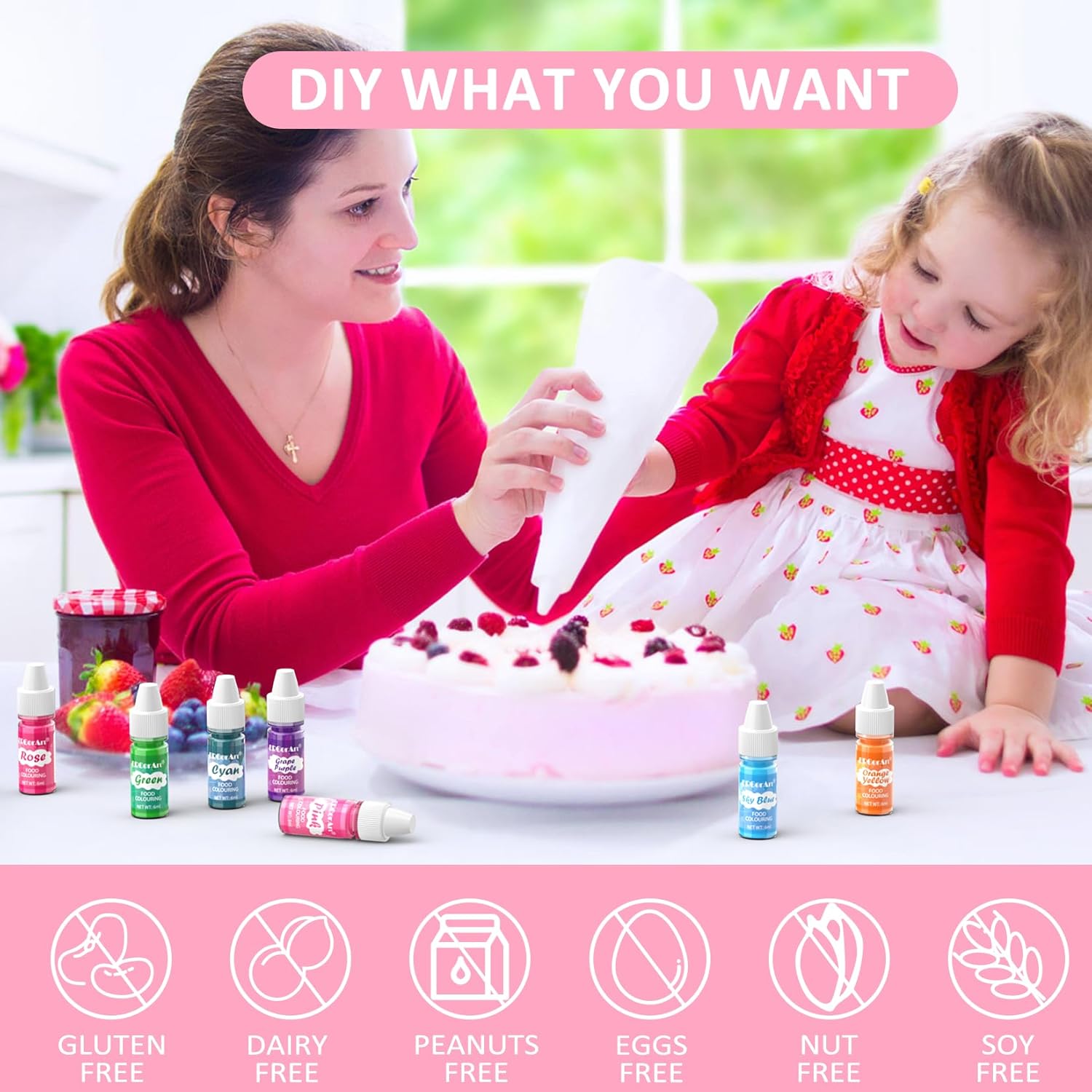 - FOOD GRADE INGREDIENTS - The Food coloring set made from safety ingredients, food coloring liquid non-dairy, non-nut, non-gluten, vegetarians can also eat with confidence. What's more, food dye are odorless and tasteless. Food coloring doesn't change the taste of the food, just makes your desserts more lively and interesting.