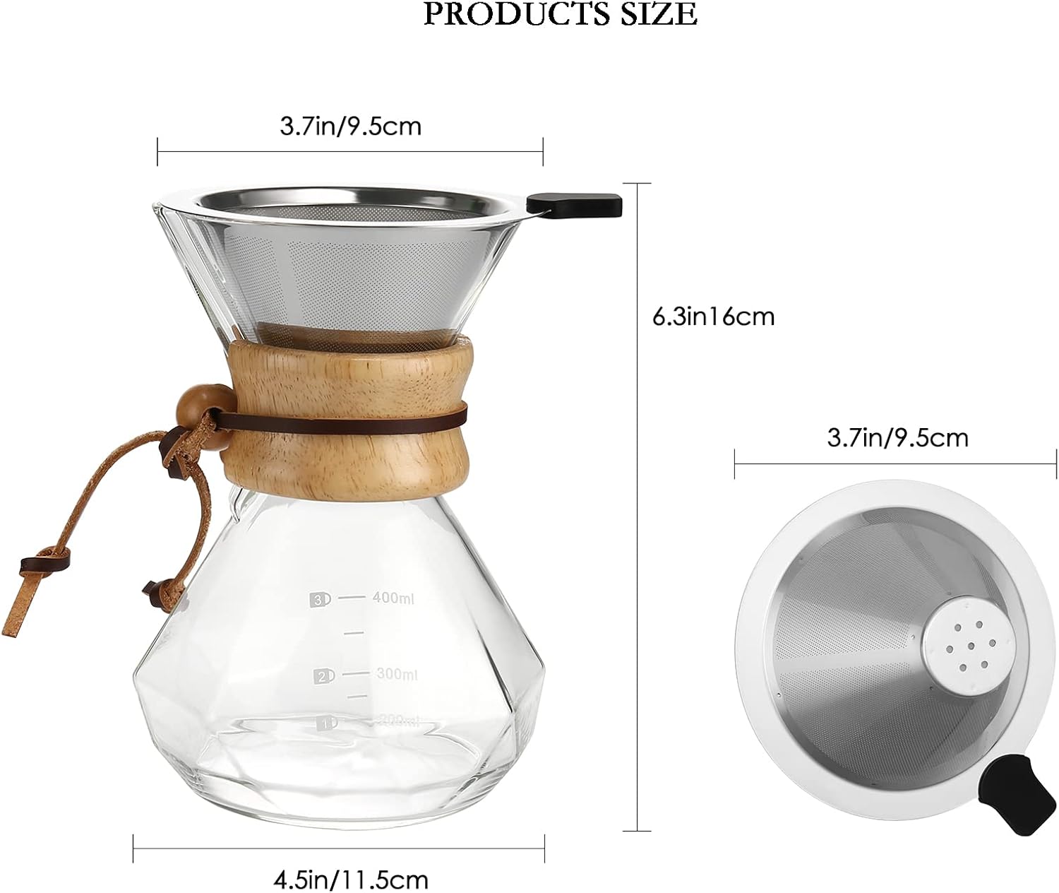 Pour Over Coffee Maker with Stainless Steel Filter, Borosilicate Glass Coffee Carafe, Modern Wooden Collar, Coffee Maker Carafe, Hold 2 Cups, 400 ml/13.5 oz, Clear