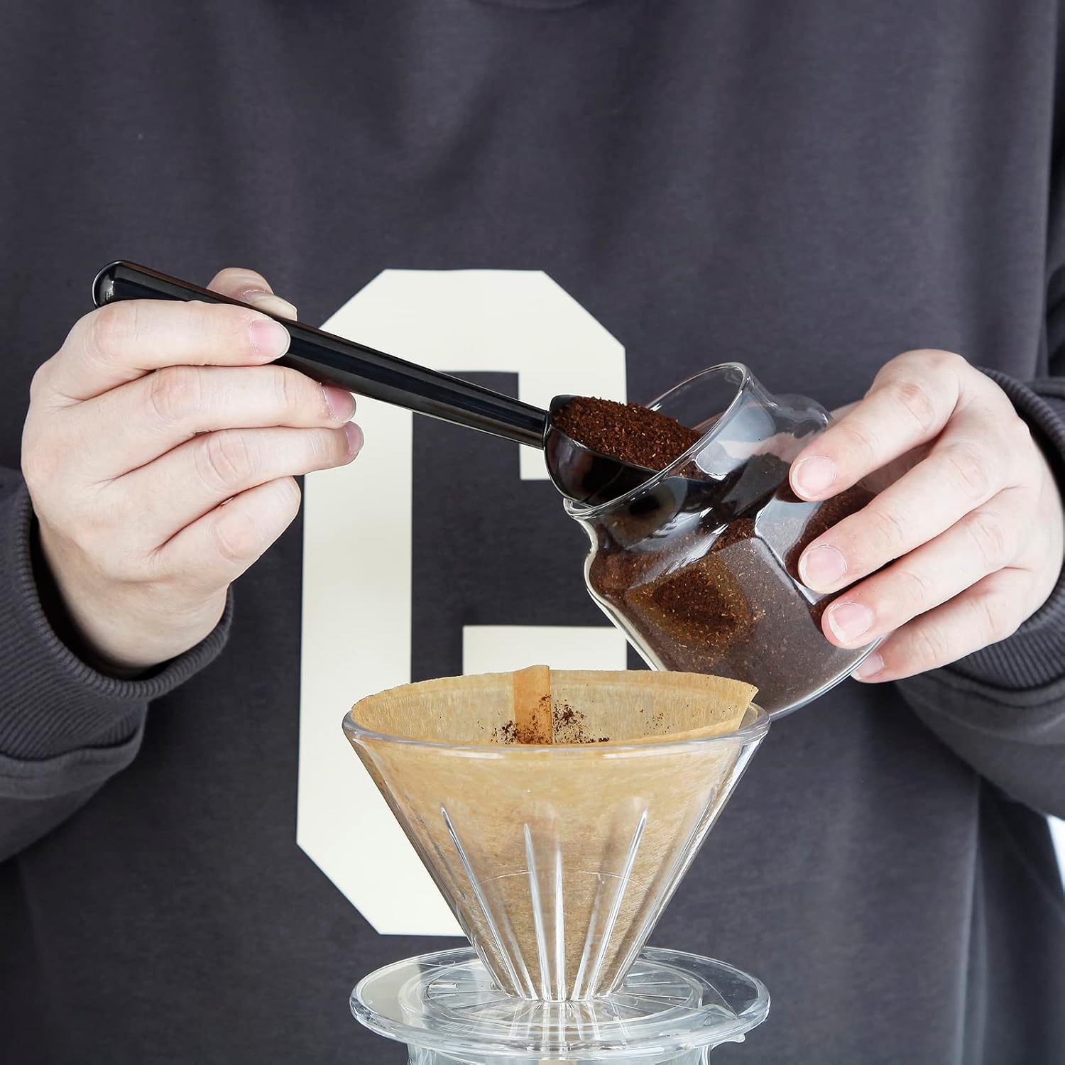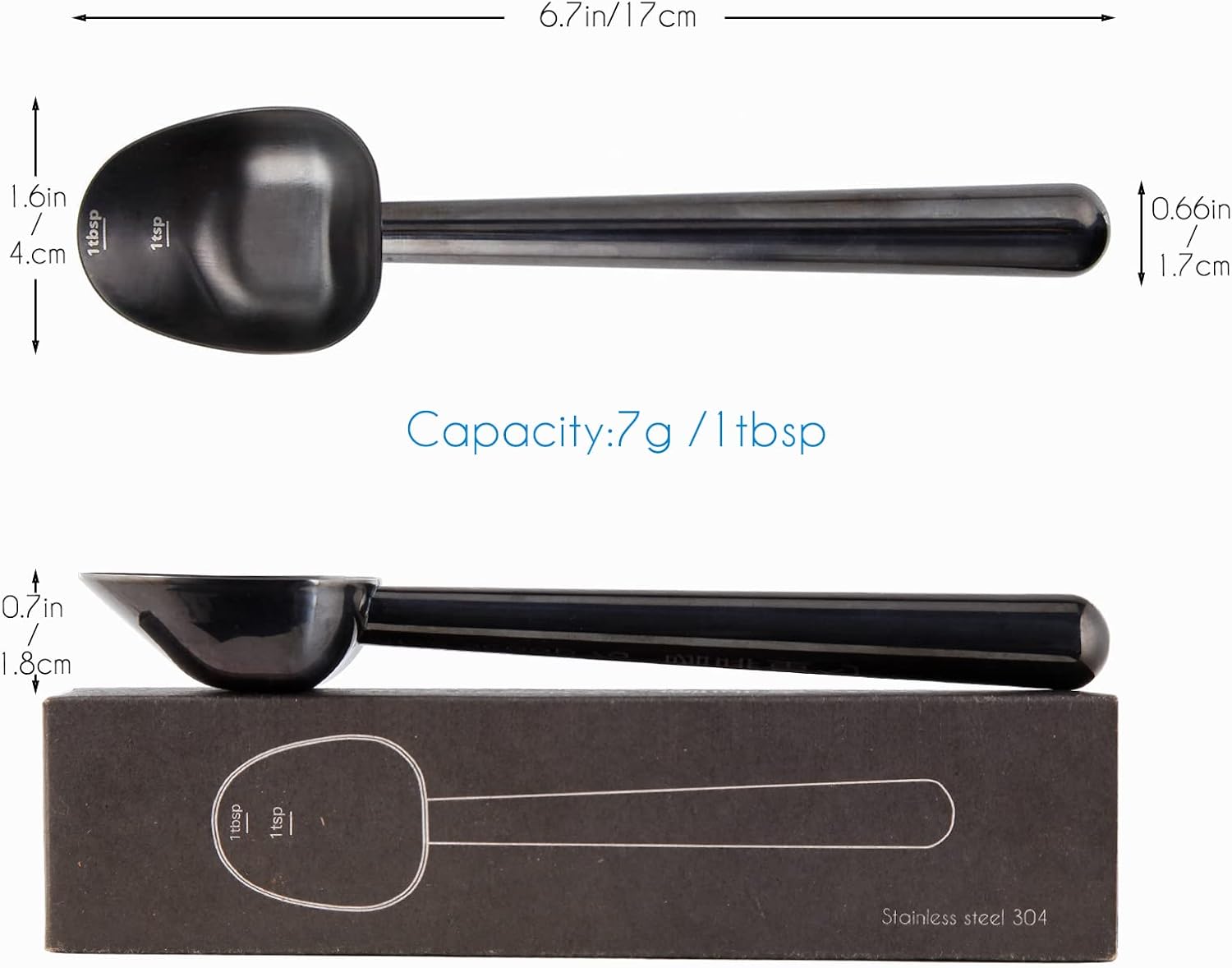 - [Quality & Design] Being made from 304 food grade stainless steel ensures it will never rust, corrode or crack and polished to perfection with a beautiful black color. This unique coffee scoop design and tapered edge makes it easy to measure coffee and tea from the bag.