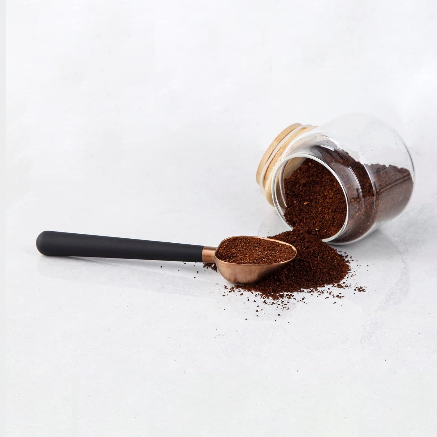 - [Quality & Design]Being made from 304 food grade stainless steel ensures it will never rust, corrode or crack and polished to perfection with a beautiful Rose gold & Black color mixture. This unique coffee scoop design and tapered edge makes it easy to measure coffee and tea from the bag.