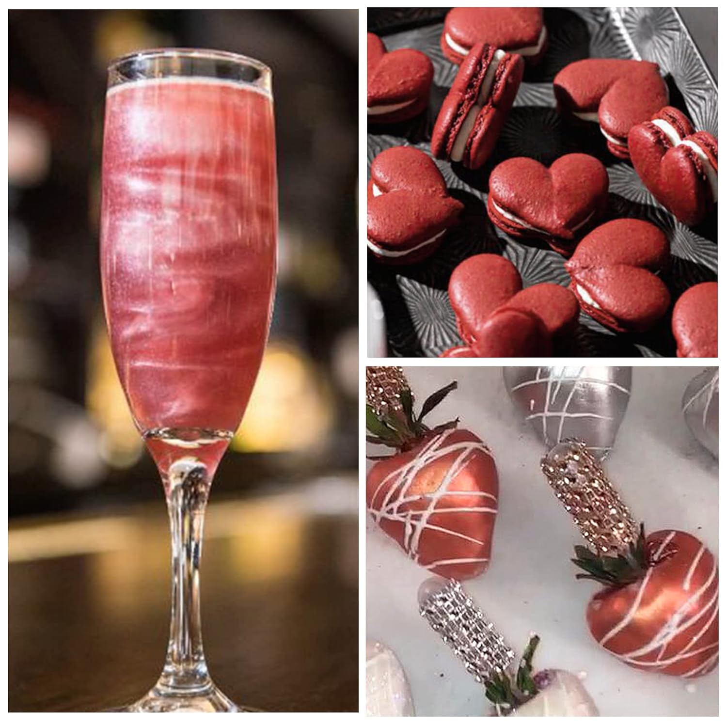 - WIDE APPLICATION - The shimmer luster dusts food coloring powder is ideal for decorating fondant, chewing gum paste, cake, icing, cookie, metallic finish, chocolate and other gourmet baked goods. You can also create shimmery cocktails, champagne or any luxury beverage.