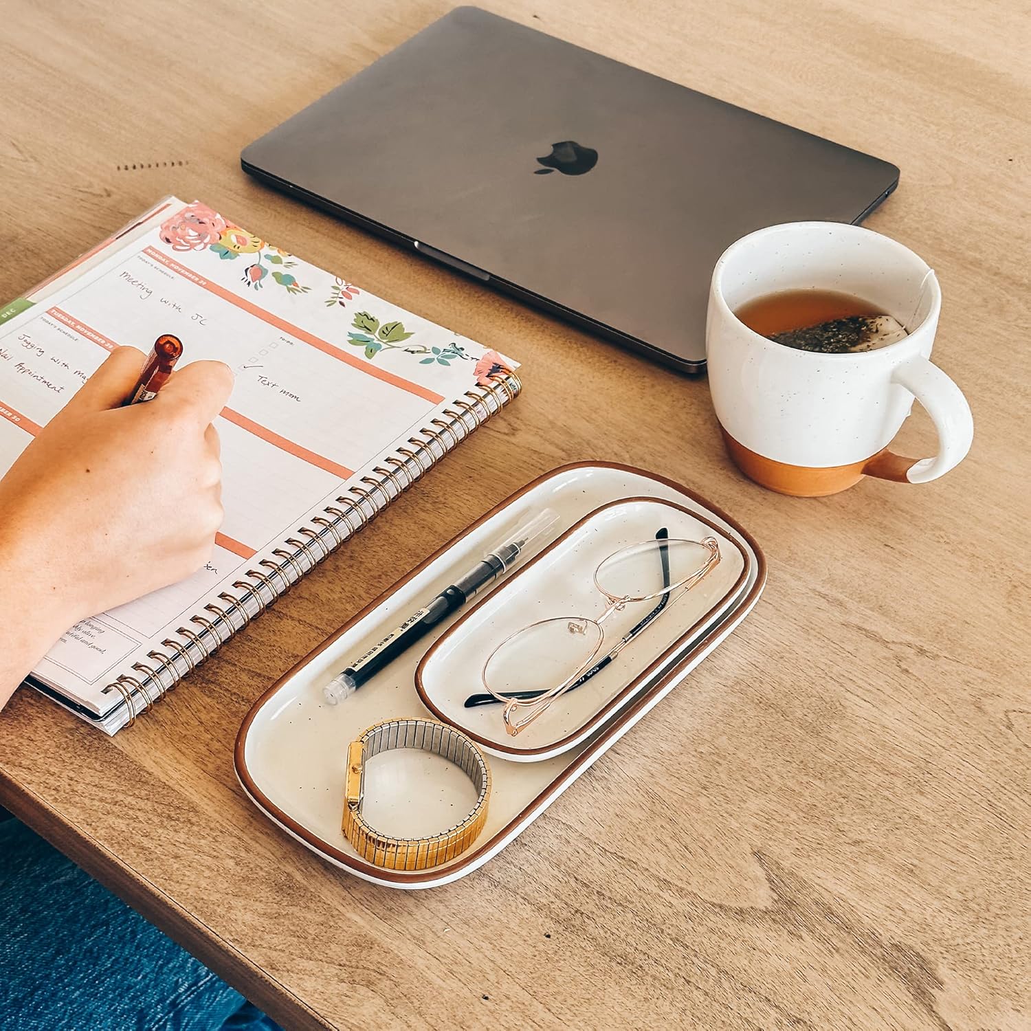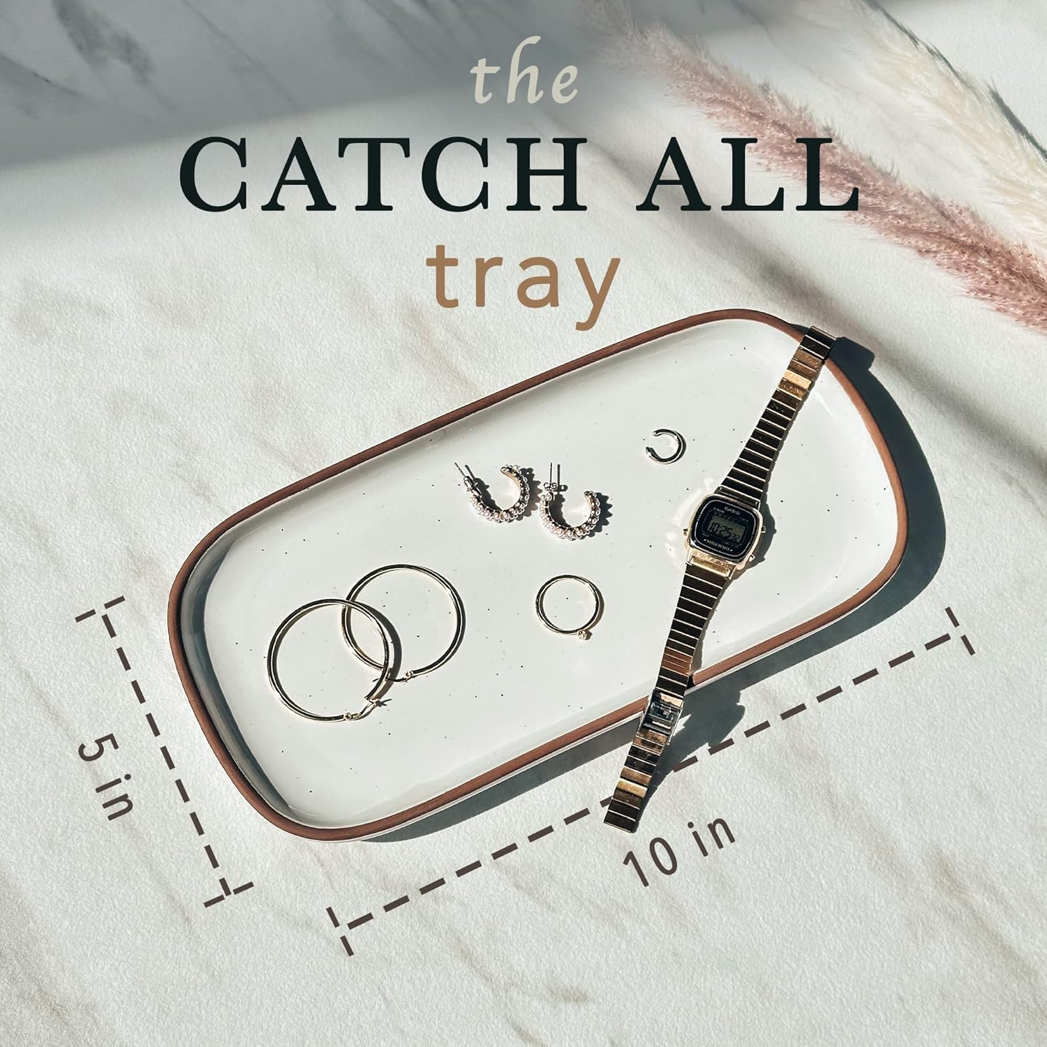 - VERSATILE USES: We all love a multi-functional object. Trays are all the rage right now and with good reason. Storing things on a tray gives a minimal and organized aesthetic and can be used for an endless amount of things. Your stationary, soap dispensers, brushes, candles, cosmetics, jewelry etc all deserve a beautiful home. The glaze is also food grade and work great for serving cheese, sushi, mini cakes, etc.