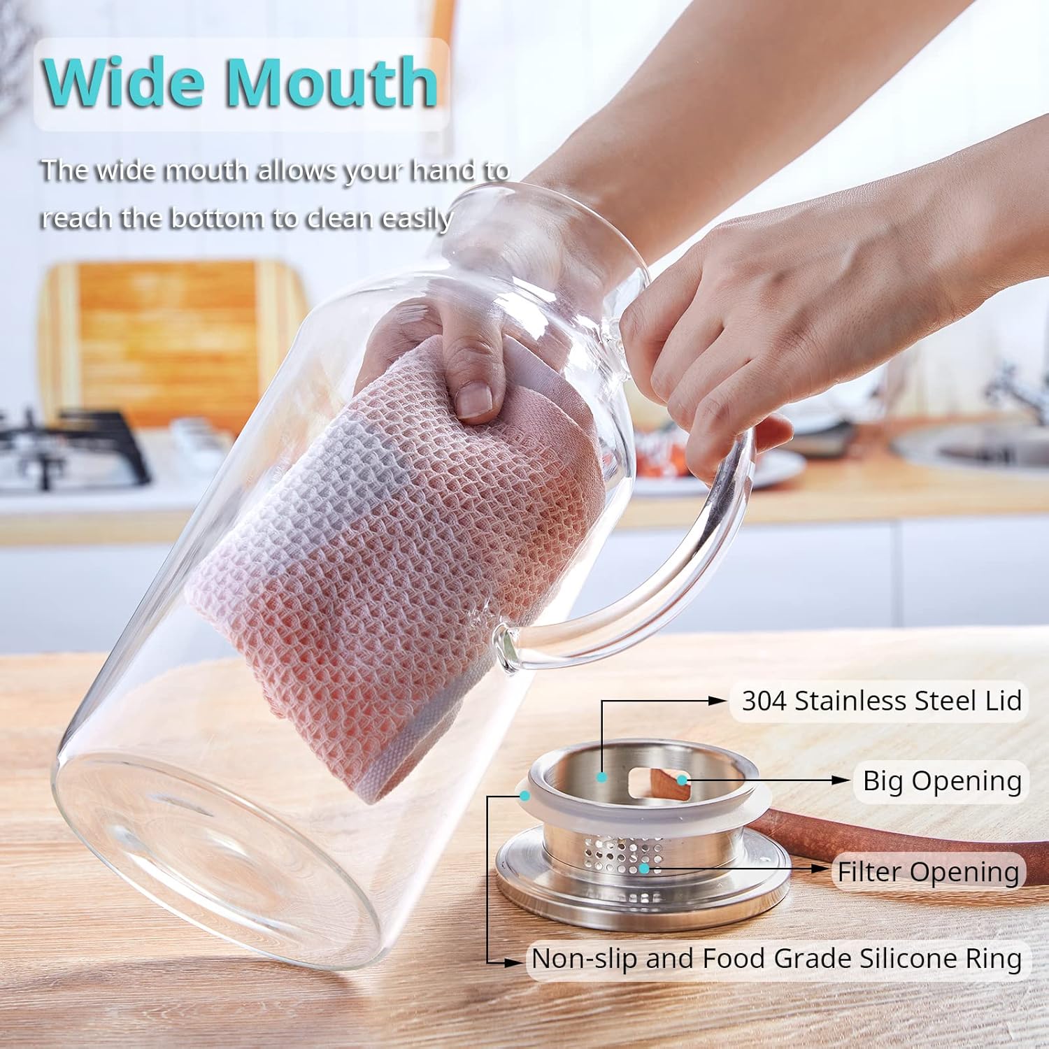 - Wide Mouth Opening for Easily Clean: Both the lid and the pitcher itself are extremely easy to clean, you can even clean it in the dishwasher. The wide mouth will allow your hand to reach in and clean down to the bottom. TIPS: THE METAL EDGES BENEATH THE RUBBER SEAL CAN BE VERY SHARP. WHEN YOU REMOVE THE SILICONE RING TO CLEAN LID, PLEASE BE EXTREMELY CAREFUL.