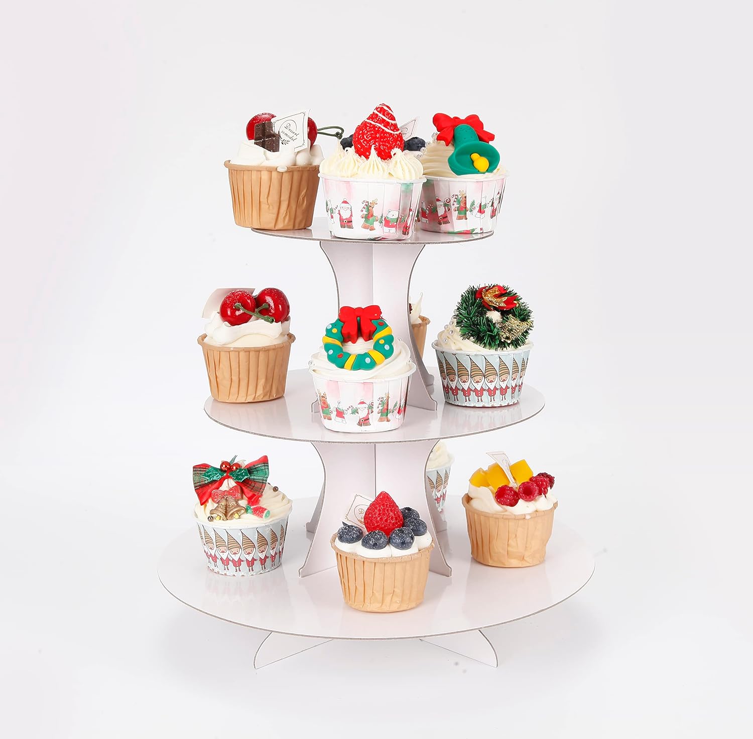 - 【Dessert Display】— This stacked 3-tier cupcake tower will be a big hit at your next party. Use this stand to display cupcakes, cookies, candies and fruit, or use it for appetizers like cheese and crackers. Three stacking sections disassemble easily and nest together for storage.