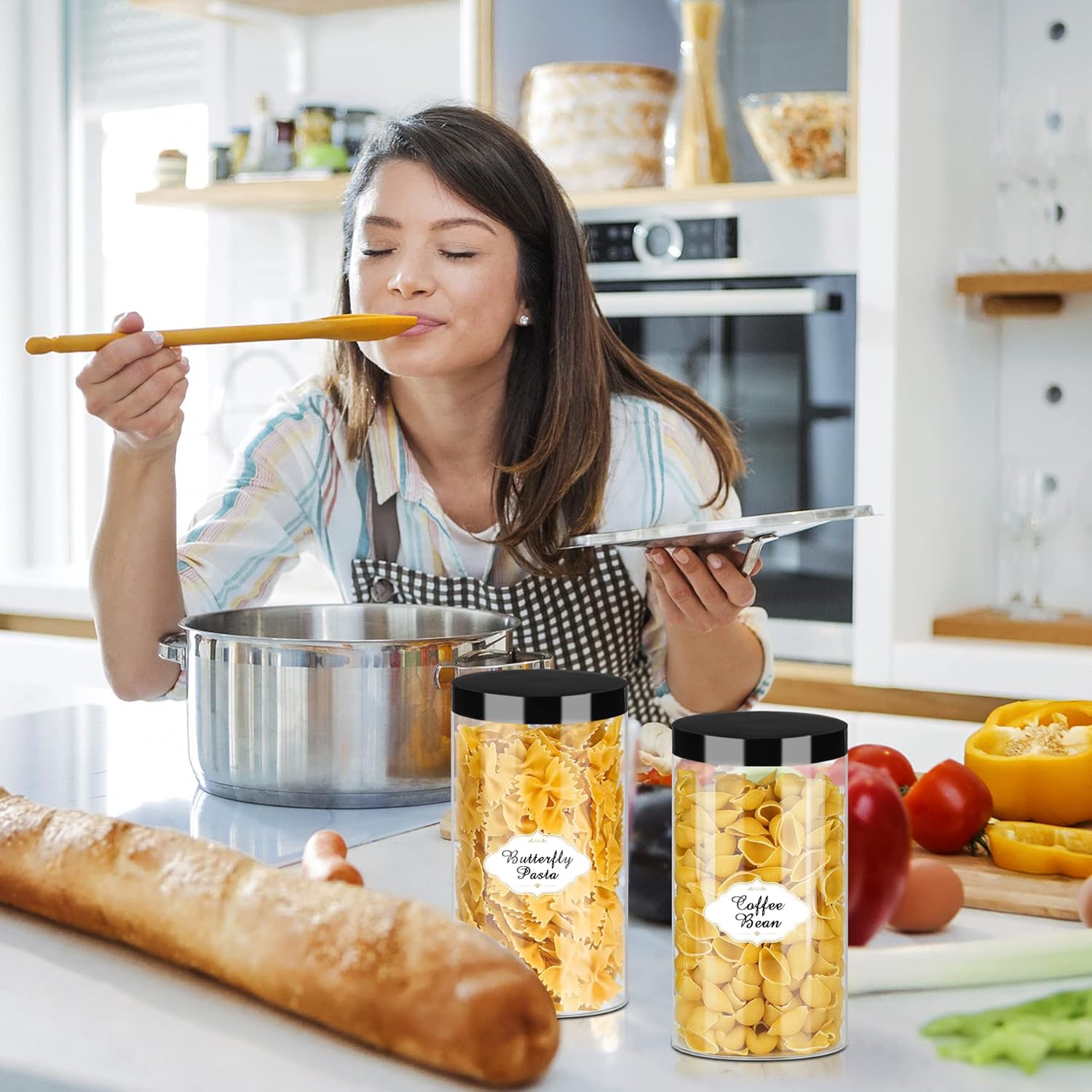 - Multipurpose Clear Round Jars: Our plastic storage jars with lids could be applied for different kinds of kitchen items, such as candies, sugar, coffee, flour, spices, tea leaves, biscuits, snacks, cookies, rice, beans, nuts, dried fruits, honey, grains, etc., These 32 oz clear empty jars are also great for playroom, garage and bathroom use. Put these plastic jars containers on the cabinets or shelves to make your home more tidy and organized with our plastic jars with lids