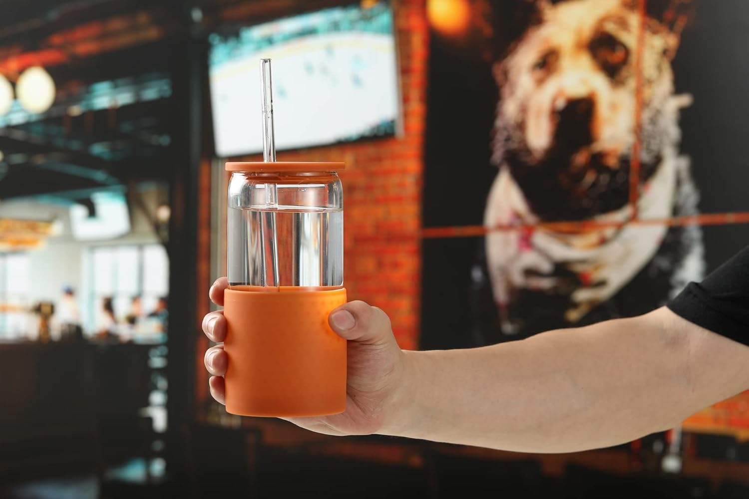 - Change the style of glass cups as you wish, you can match the colors of the cup lid and sleeve, such as a pink sleeve with a white lid. This reusable jar-shaped glass cup is perfect for iced coffee, iced tea, juices, sodas, milkshakes, jams, cocktails, beer, smoothies, bubble teas, and more.