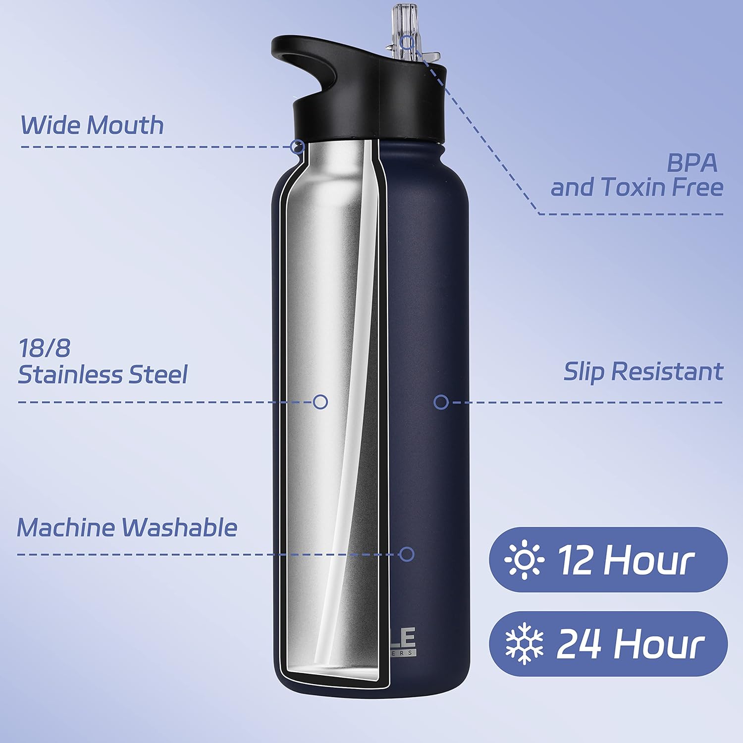 - 【DOUBLE WALL VACUUM INSULATION】Our water bottles with straw are constructed with double wall vacuum insulated technology, keeps beverages Cold up to 24 hours and Hot up to 12 hours. Made of non-toxic BPA-free plastics & durable food-grade stainless steel. The anti-slip layer ensures you hang on to your bottle during the toughest activities.
