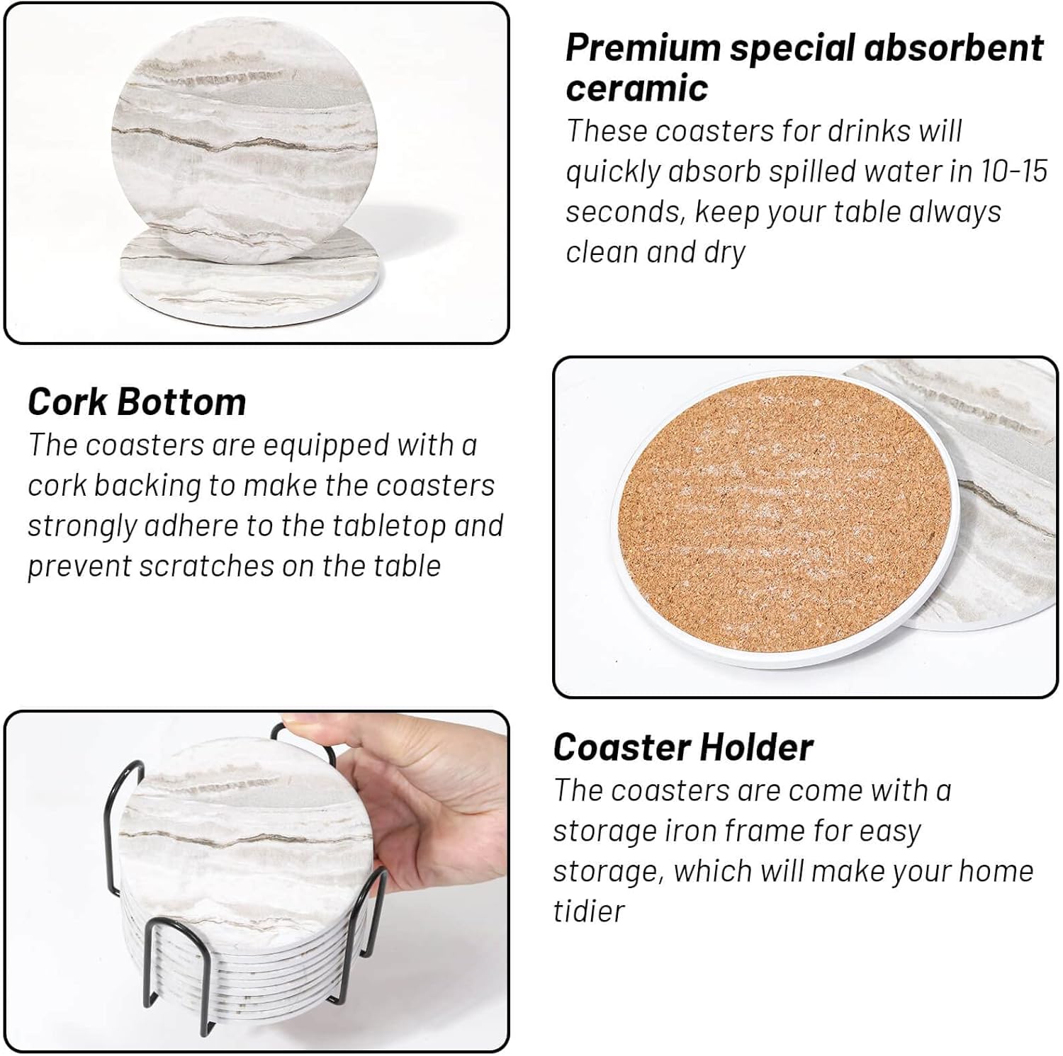 - Decorative Coasters: These marble appearance cup coasters are great to decorate your kitchen, living room, bedroom or office. With our absorbent coasters, you don't worry about the drink drip and dirty your favorite table. You can enjoy a good time with your family or friend together.