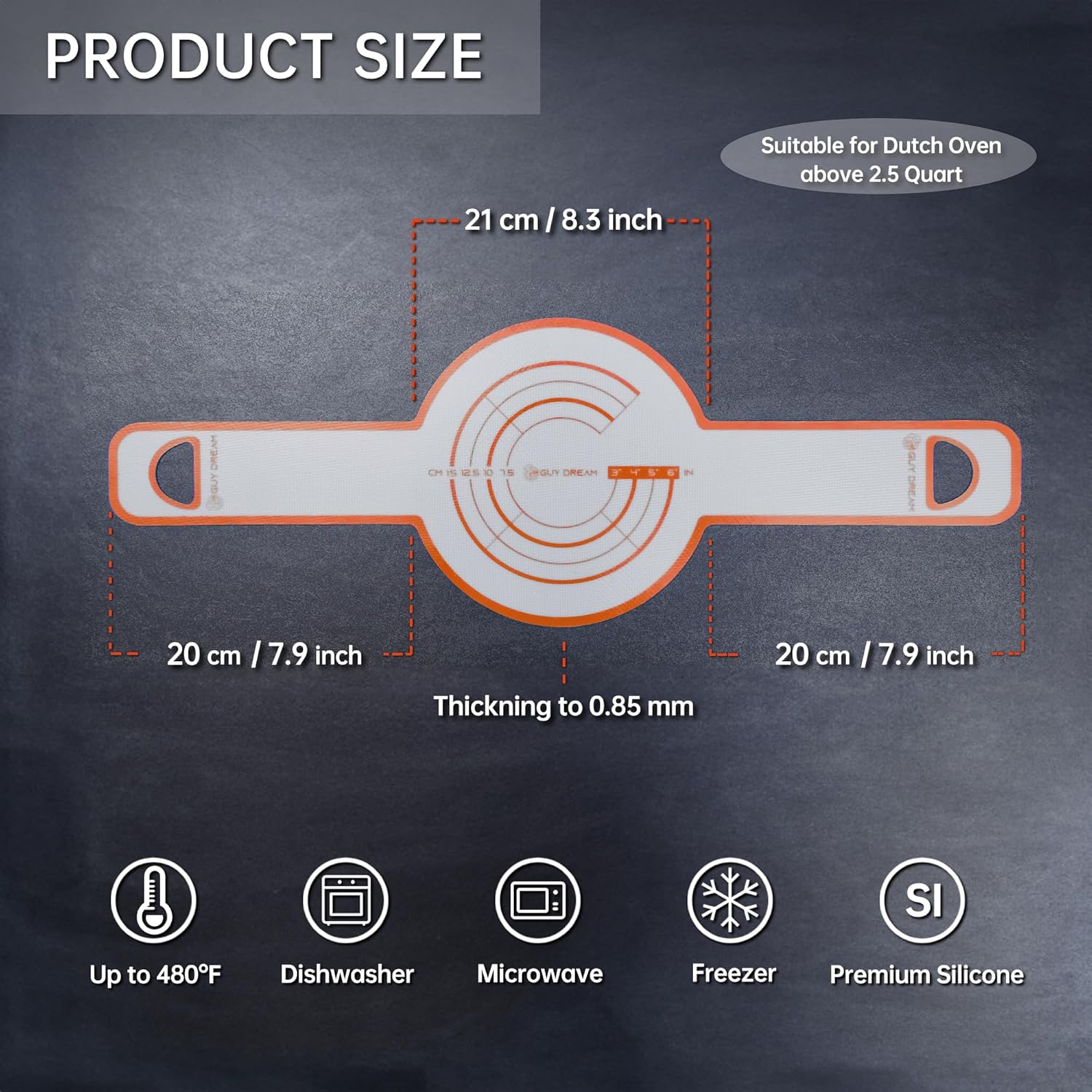 - 【ULTRA THICK】The thickness of GUY DREAM mats are 0.85 MM. They are 30% thicker than our classic models, and they are twice as thick as other dutch oven mats in the market.
