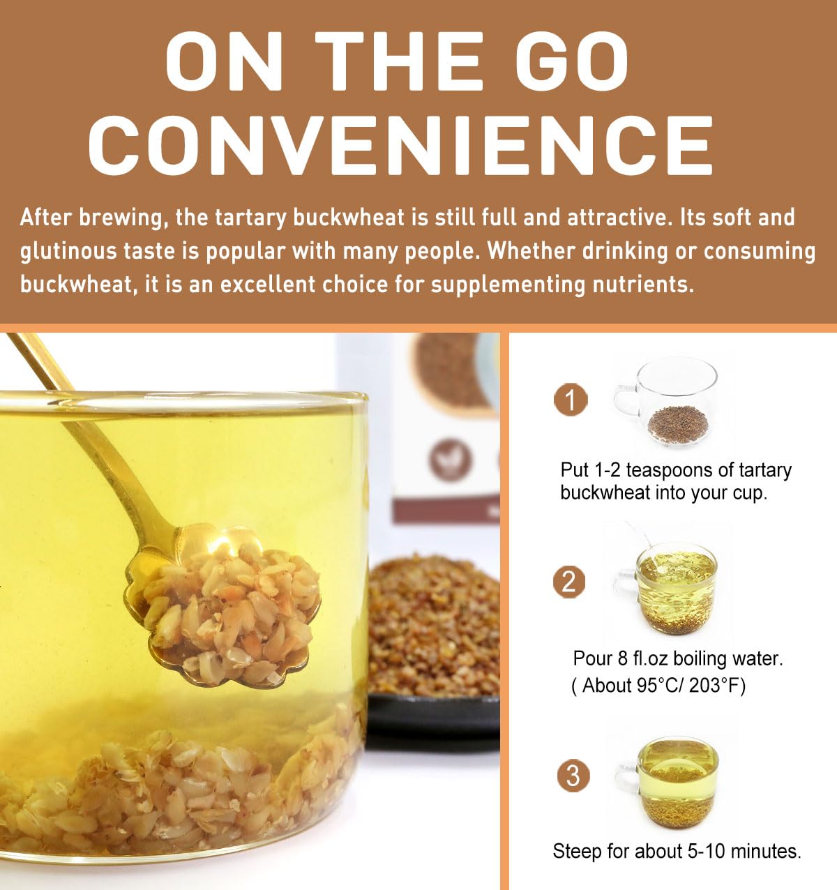 - 【Easy to Use】After cutting, these smaller shaped tartary buckwheat can better release the flavor and nutrition. Just put 1-2 teaspoons of tartary buckwheat into your cup, add 8 fl.oz of boiling water. Steep for about 5 minutes. Enjoy it.