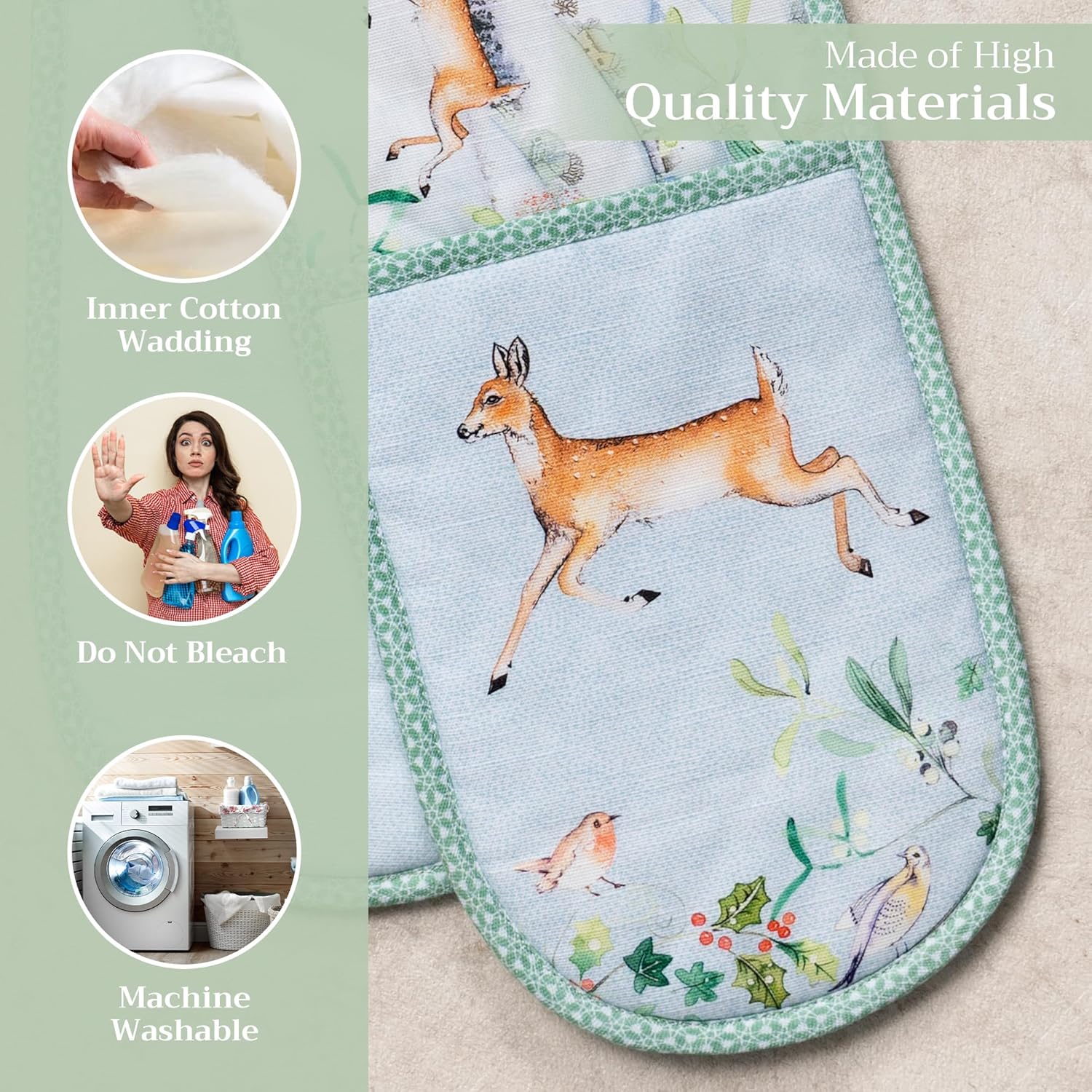 - 100% Quilted cotton: Crafted from premium quilted cotton for superior heat resistance and durability. This double oven mitt offers a soft, flexible grip and protects your hands during baking, roasting, or grilling