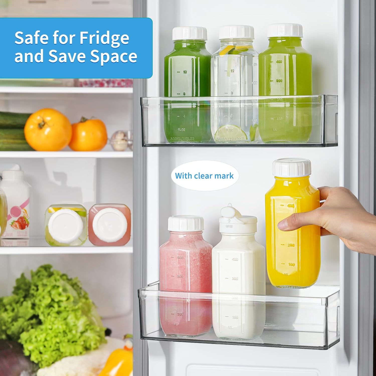 - Perfect Size: Each juice jar features: 2.65" W x 6.96" H. Its square shape is designed to provide a comfortable and easy grip and save space, fit most car cup holders and fridge doors. Wide mouth(1.3 inches) allows filling up, adding ice, and cleaning easy