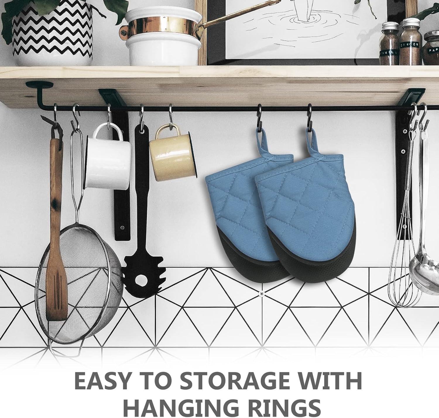Qulable 1 Pair Short Oven Mitts - Silicone Kitchen Oven Gloves High Heat Resistant 500℉, Mini Oven Mits with Non-Slip Grip Surfaces and Hanging Loop for BBQ, Baking, Cooking and Grilling (Bule)