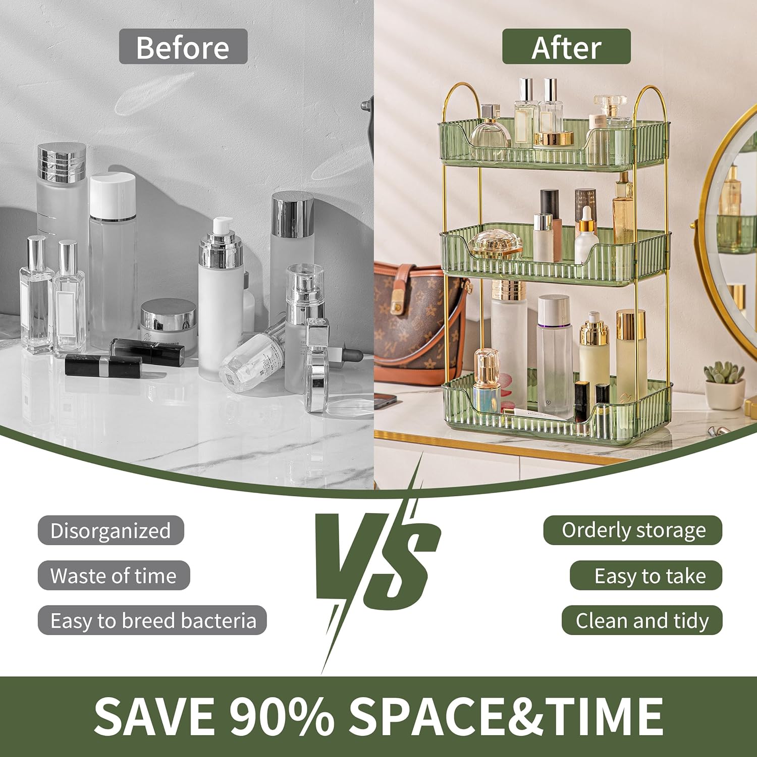 YCIA&DONE Bathroom Organizer Countertop, Makeup Storage, Skincare Cosmetic Tray Shelf, Perfume Holder Rack for Vanity Counter, Large Capacity, Easy to Install, Clean, 3 Tiers, Vintage Green