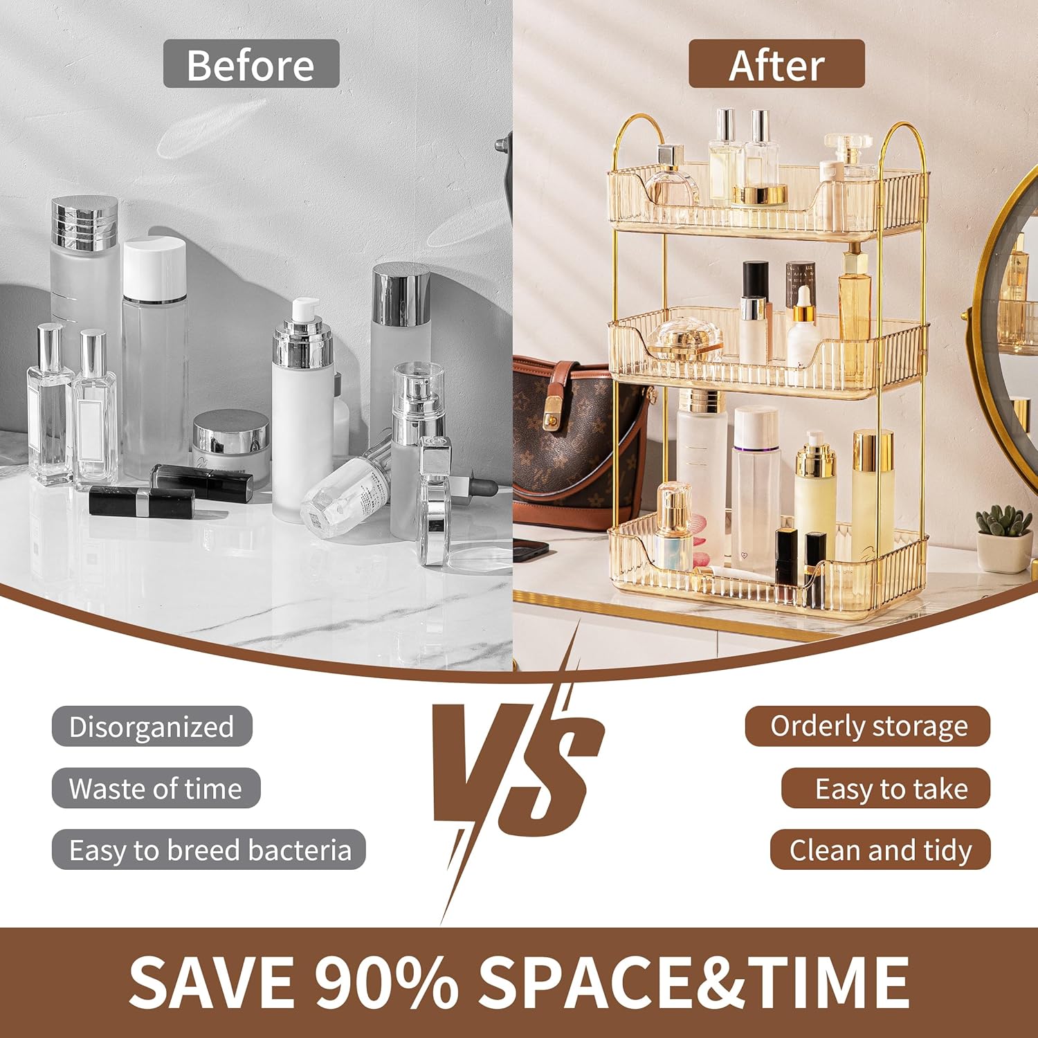 YCIA&DONE Bathroom Organizer Countertop, Makeup Storage, Skincare Cosmetic Tray Shelf, Perfume Holder Rack for Vanity Counter, Large Capacity, Easy to Install, Clean, 3 Tiers, Amber Gold