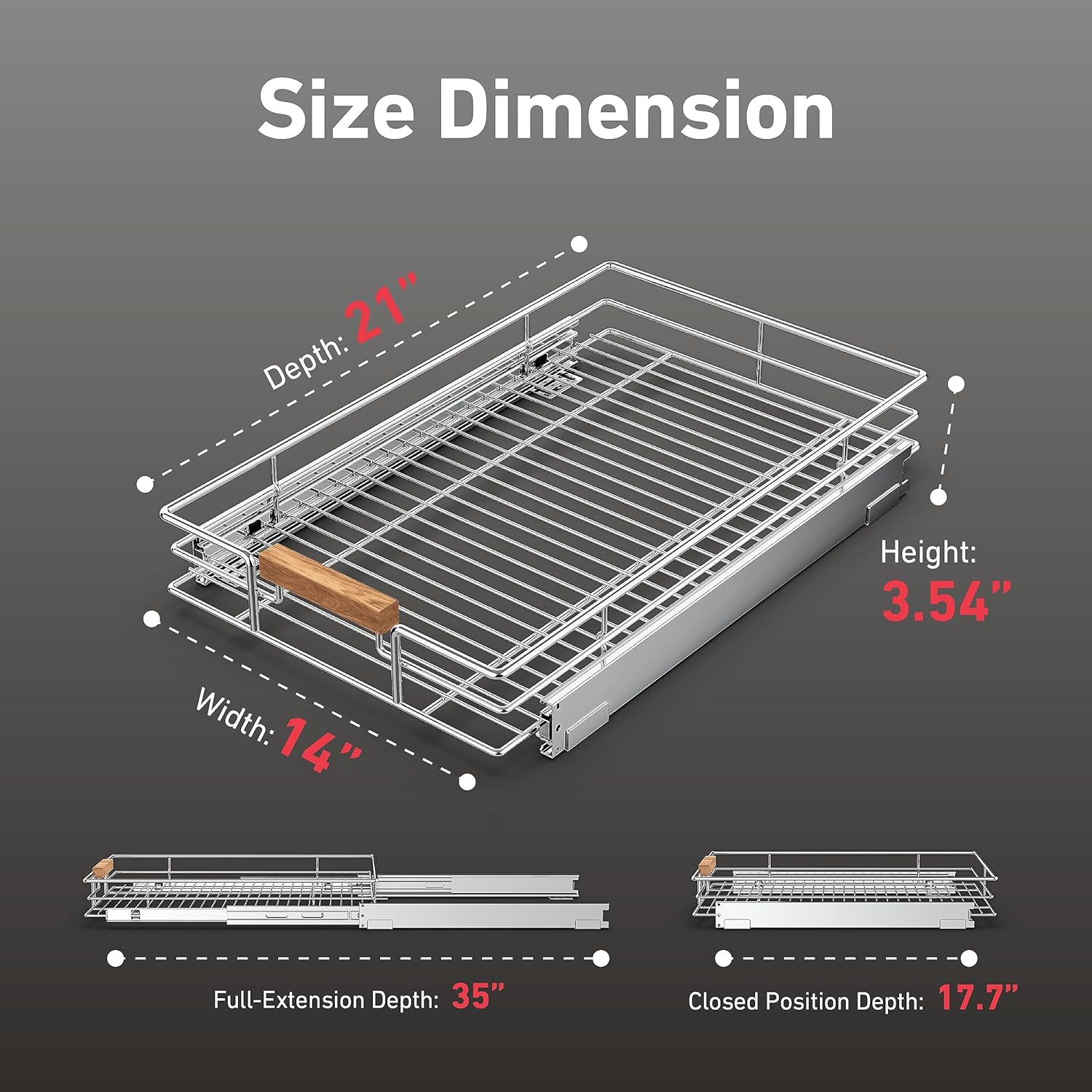 - 【Easy to Install】Our pull out cabinet shelf dimensions measure 14"W x 21"D x 3.54" and includes installation manual along with all of the hardware necessary for easy installation. Installs with just a few simple screws, and fits cabinet openings 15" and larger.
