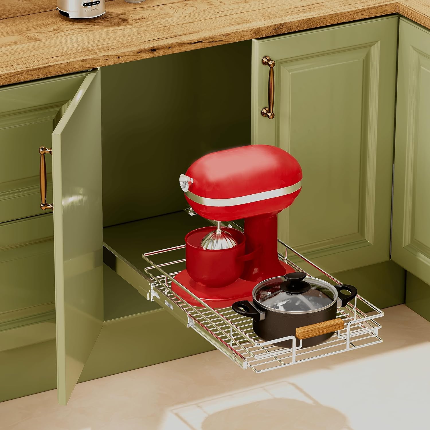 - 【Full Extension Sliding Out Basket】Made out of heavy-duty metal with full extension smooth sliding system with good fuction wood handle, you can make the most of cabinet space and easily access all your pots, pans, small kitchen appliances.