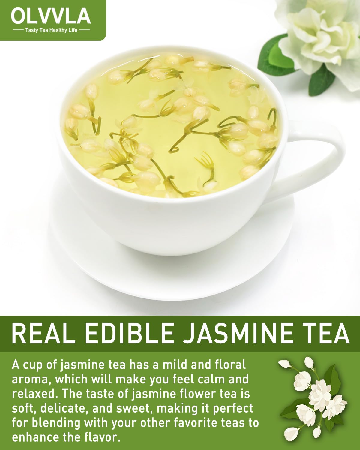 - REAL JASMINE TEA: A cup of jasmine tea has a mild and floral aroma, which will make you feel calm and relaxed. The taste of jasmine flower tea is soft, delicate, and sweet, making it perfect for blending with your other favorite teas to enhance the flavor;