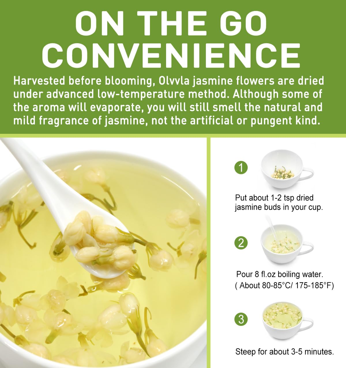 - NATURAL AROMA: Harvested before blooming, Olvvla jasmine flowers are dried under advanced low-temperature method. Although some of the aroma will evaporate, you will still smell the natural and mild fragrance of jasmine, without pungent flavor;